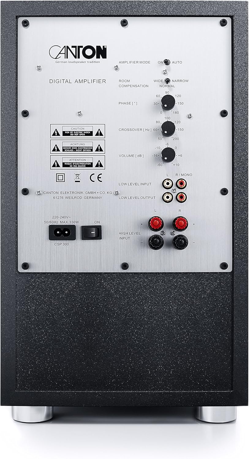 Мощният усилвател на мощност има също превключваща се настройка на помещението, непрекъснат фазов контрол и ниско ниво на изход, например за свързване на друг субуфер.