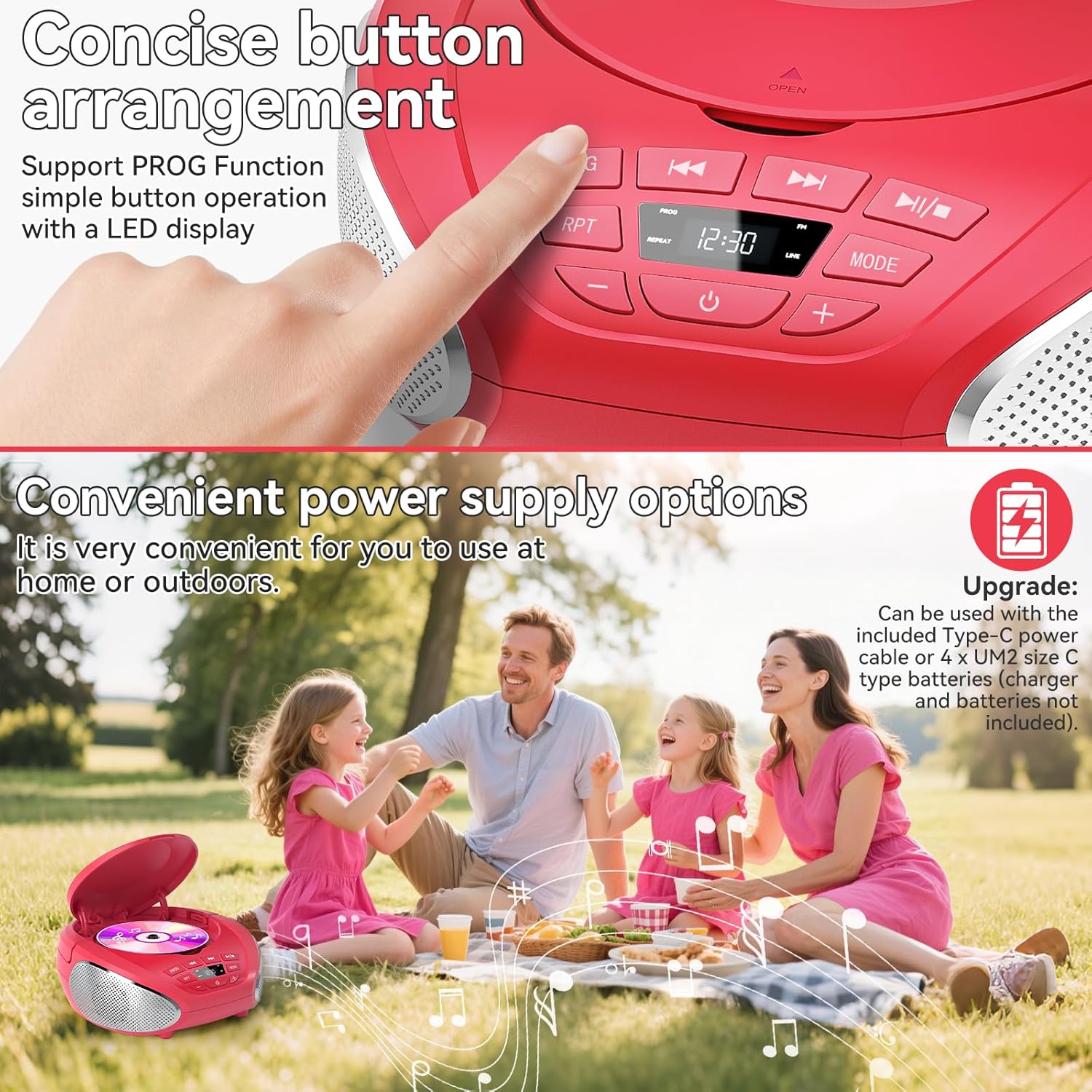 • Множество опции за захранване: Захранвайте CD плейъра за деца с включения кабел за данни Type-C или 4 батерии UM2 размер C тип 1.5V (не са включени) за гъвкава употреба. Лесен за употреба, без дистанционно управление. Идеален за любители на дейности на открито, идеален за къмпинг, пикници, плажни екскурзии и барбекюта в задния двор. Забележка: Не поддържа Bluetooth или зареждане и не включва дистанционно управление или външна FM антена (вградена FM антена).