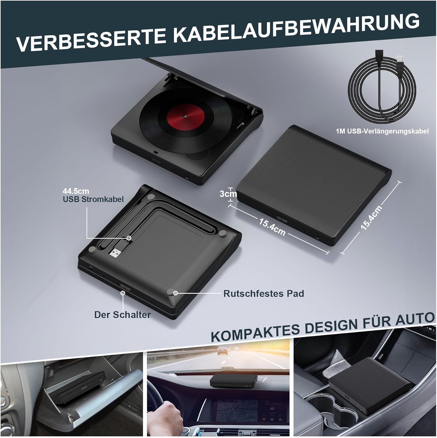 • Подобрено съхранение на кабели – Външното USB CD устройство за кола разполага с място за съхранение на кабели директно на гърба. Край на заплетените кабели. Благодарение на компактния си размер, външният CD плейър за кола с USB връзка може удобно да се инсталира в таблото, централната конзола или жабката. (Включен е и 1-метров USB кабел за удължаване.)