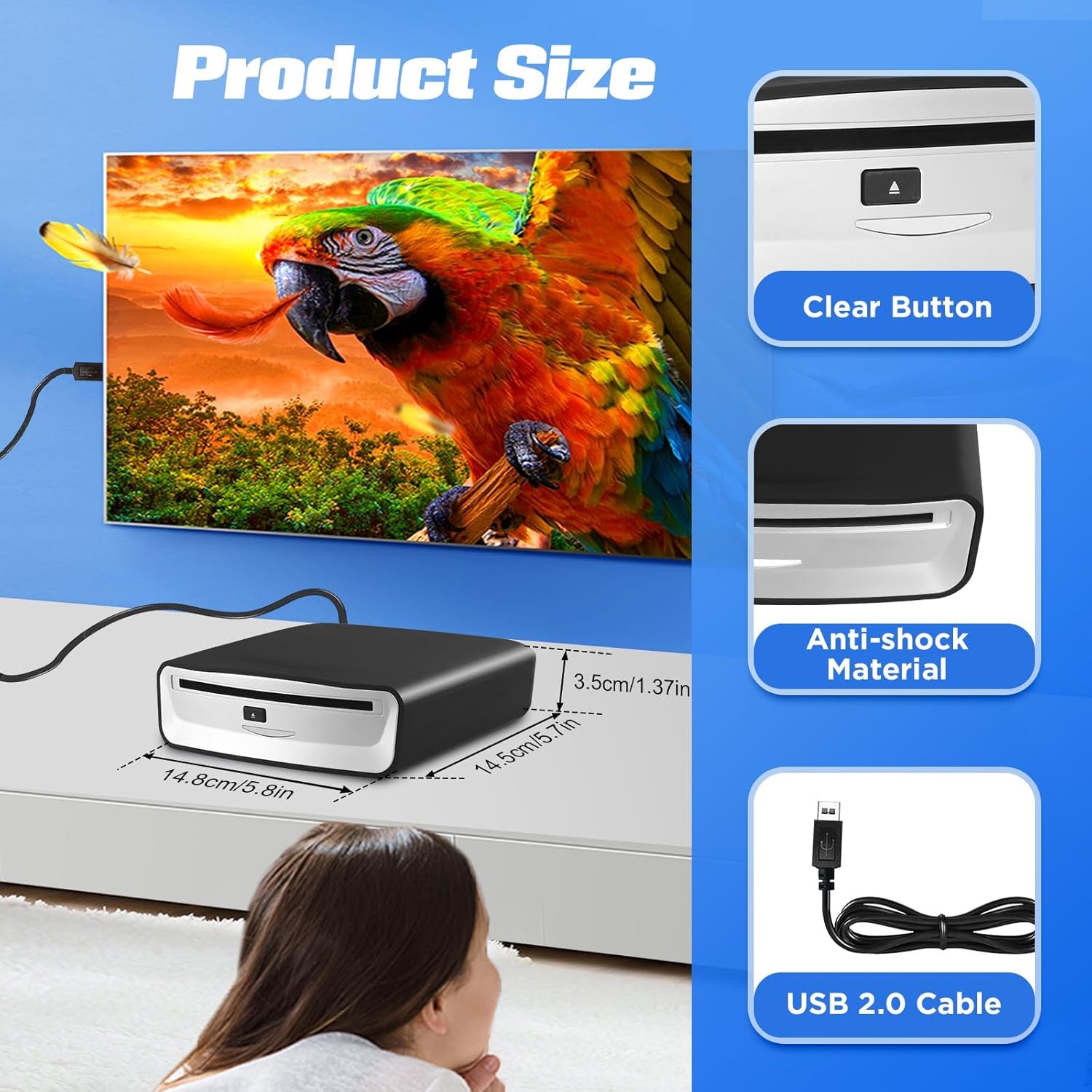 • 【Обновен чипсет】Този DVD плейър е външно стерео устройство с USB 2.0 интерфейс. Напрежението на захранващия конектор е между 4.75V и 5.25V, с номинална стойност 5V. Идеален е за автомобили без вграден CD плейър. Благодарение на новия чип, той предлага подобрено възпроизвеждане, анти-прескачане, съвместимост, намаляване на шума и пренос на данни. Захранва се чрез USB кабел, не изисква допълнителен адаптер и има ниска консумация на енергия.