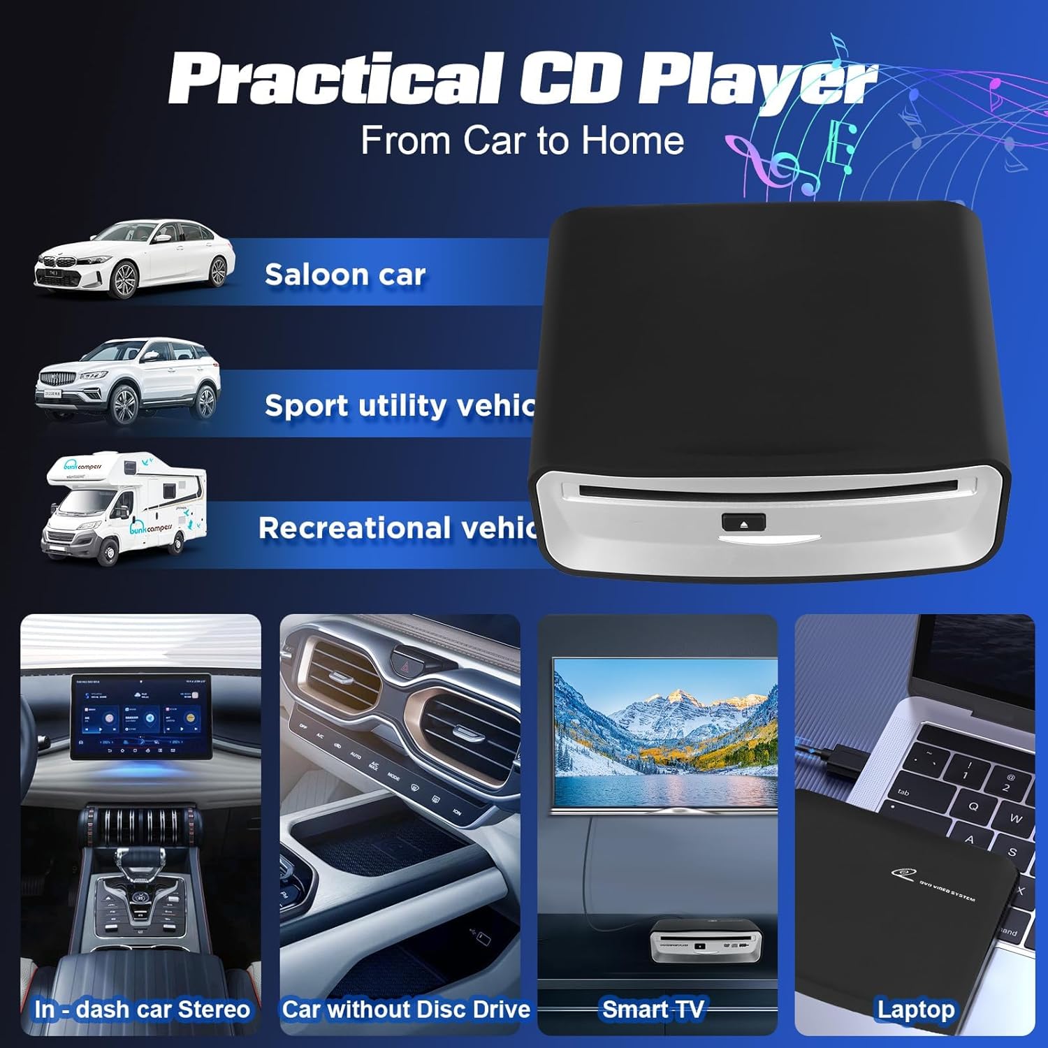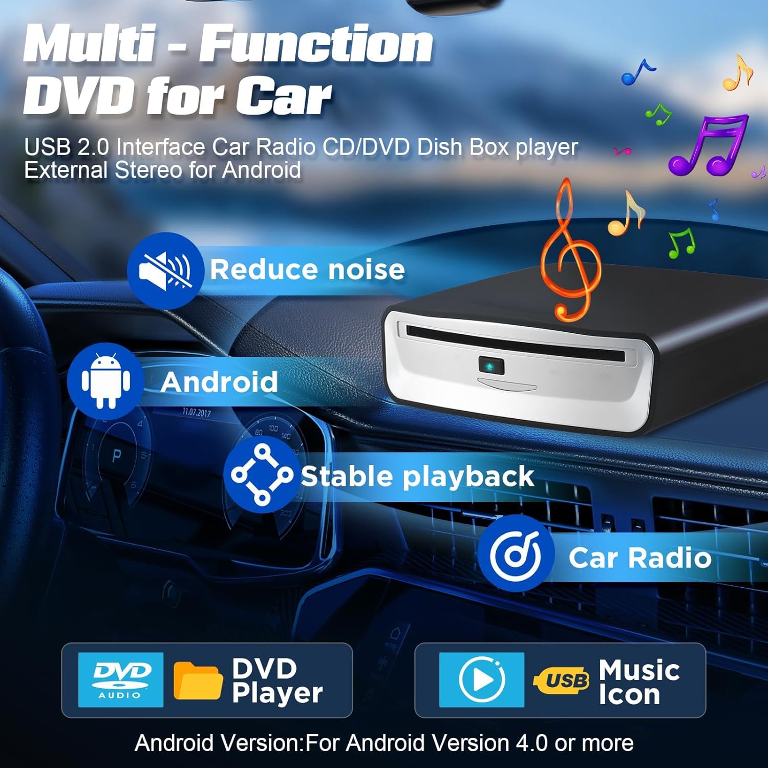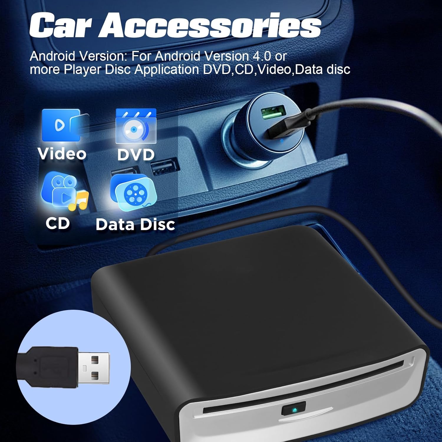 • 【Широка съвместимост】Подходящ за продукти и устройства с Android 4.4/5.1/6.0/7.1 или по-нова версия, съвместим твърд диск: 12 см оптично устройство. Можете също да го свържете към вашия компютър, лаптоп, телевизор и др. (Забележка: Ако CD-DA дискът не може да се чете, когато е свързан към LCD телевизор или ако използвате домашен CD плейър в колата си, това означава, че автомобилният хост не е съвместим с WAV музикалния формат. В този случай е необходим допълнителен декодер. Ако CD-DA дискът може да се чете, но DVD дискът не може, това означава, че автомобилният хост не е съвместим с VOB видео файлове.)