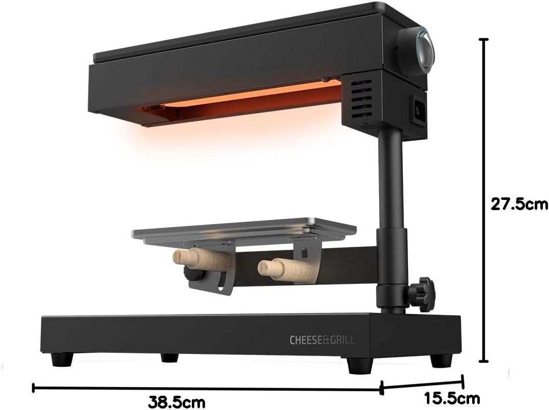 Andererseits verfügt er über einen dreh- und neigbaren Griff zur Einstellung der Höhe des Raclettes, sowie einen Käsehalter mit 2 Holzgriffen, mit dem Sie die Neigung und den Winkel von Tablett und Käse verstellen können.