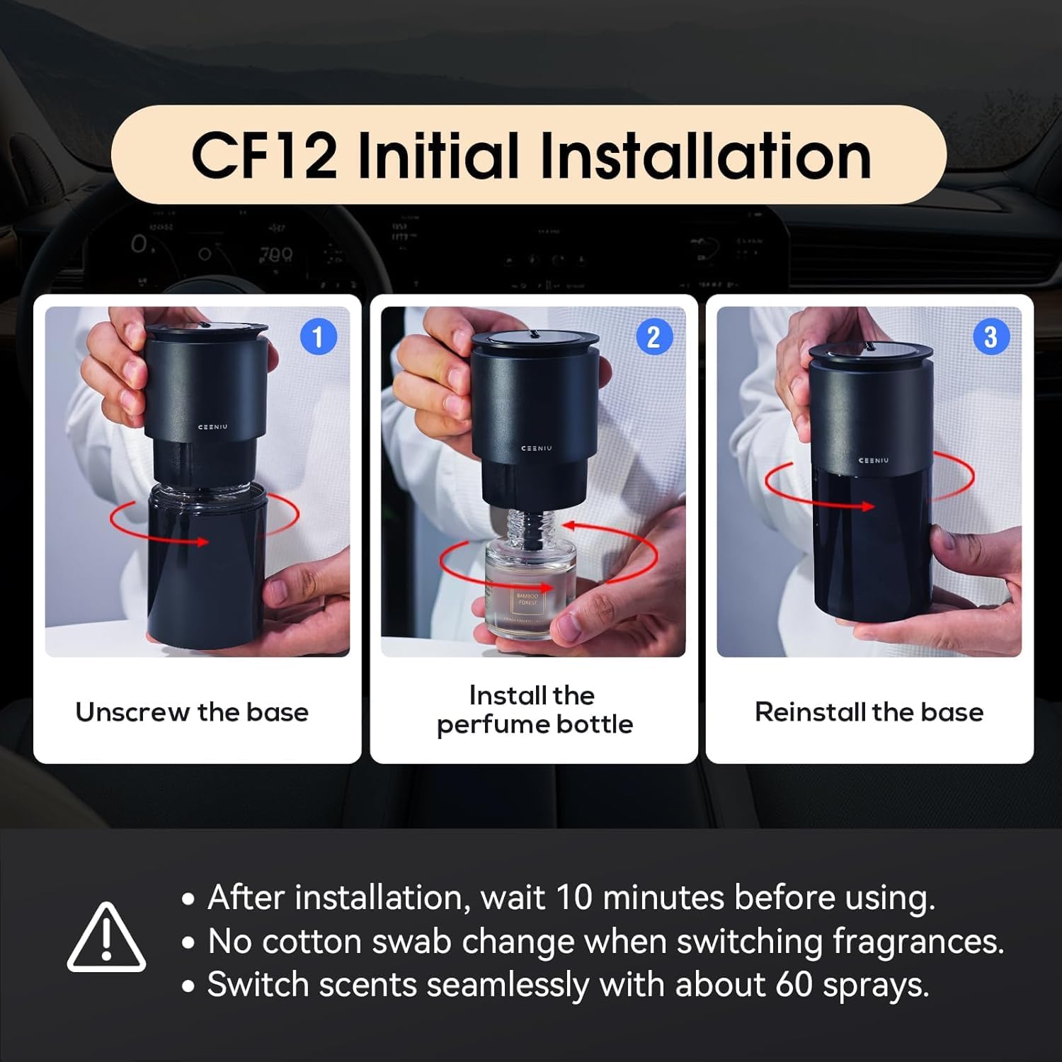 • Приложение: Отворете основата на устройството и завийте вертикално парфюмната касета в освежителя за въздух за кола. Затегнете основата и изчакайте 10 минути преди употреба. След смяна на парфюмната касета, тя постепенно ще превключи към новия аромат след приблизително 60 впръсквания.