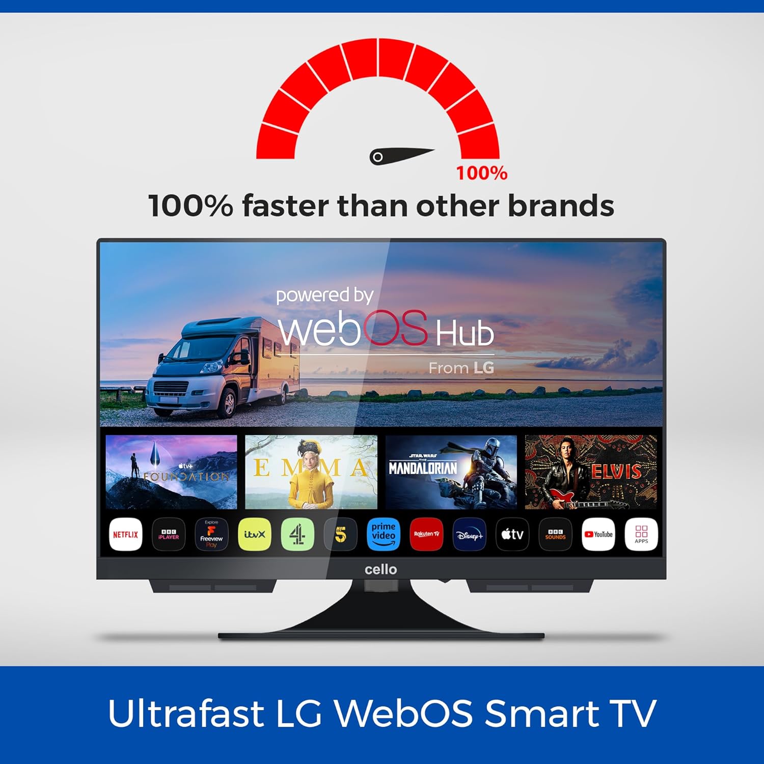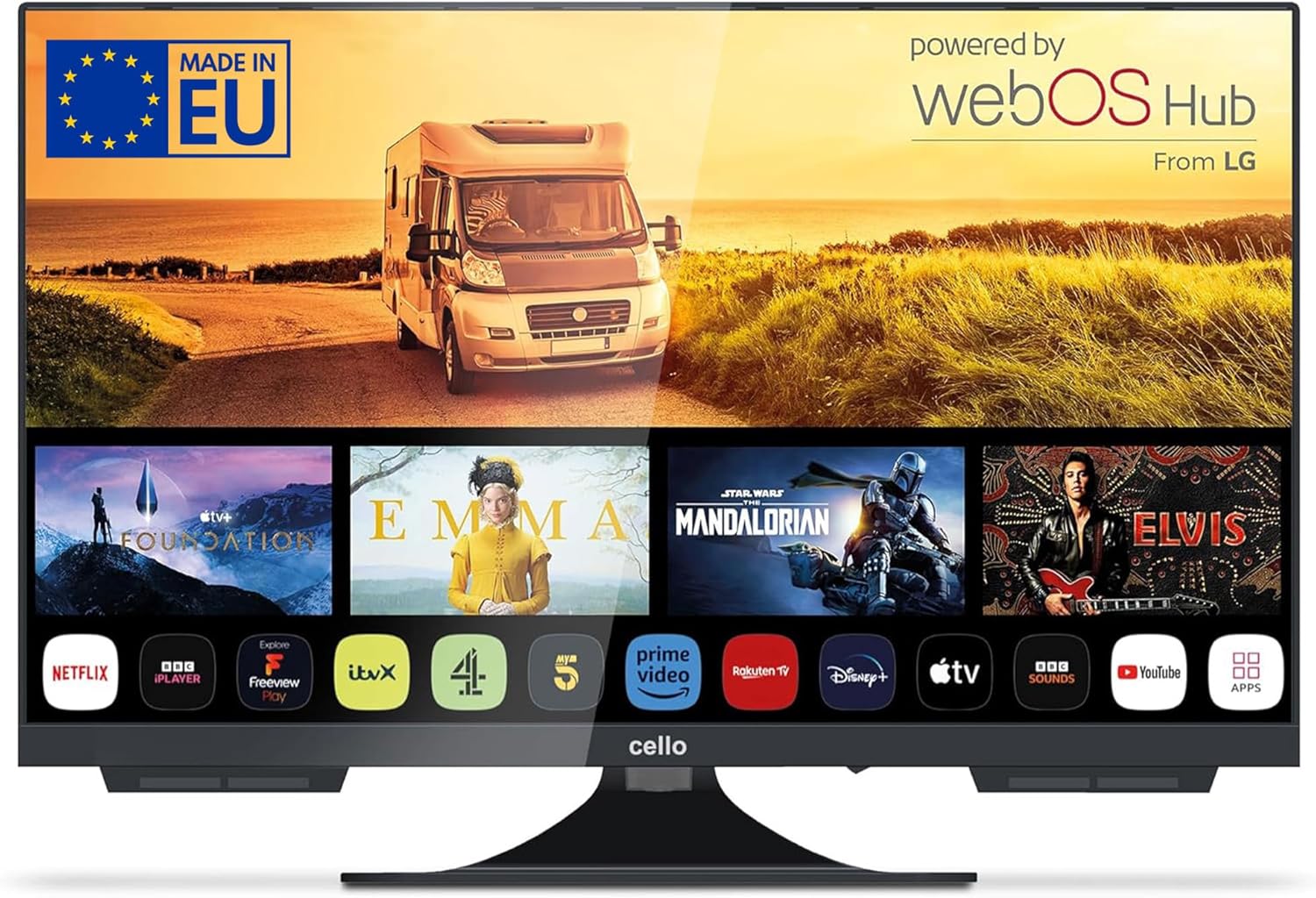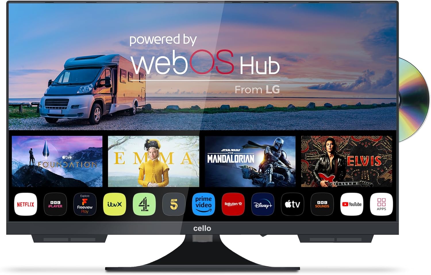 Cello C1924WSF 12V 19-инчов смарт телевизор без рамка с вграден DVD плейър, ултрабърза WebOS, Freeview Play, Pitch Perfect високоговорители, Bluetooth малък телевизор за кемпери