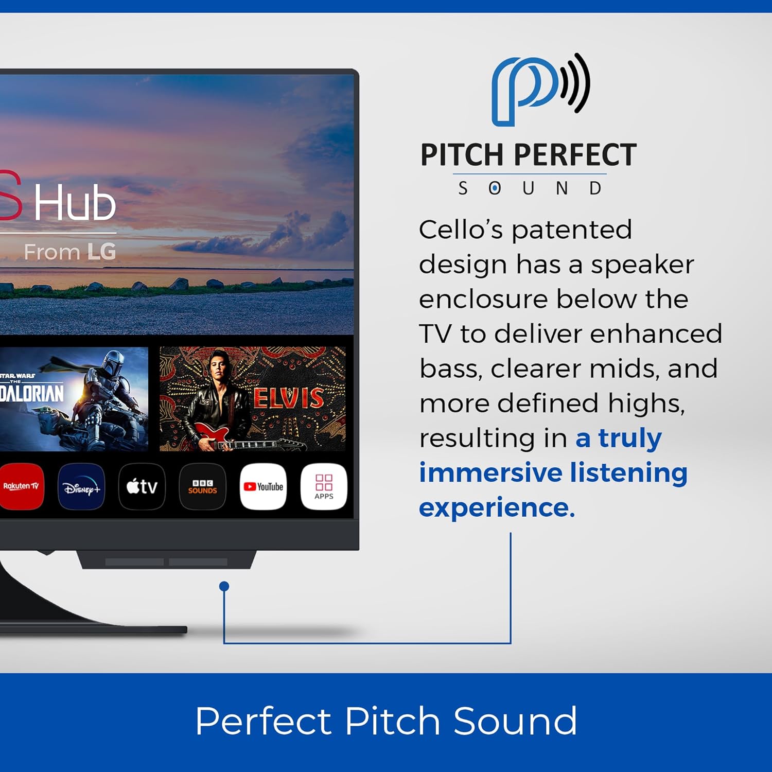 • Pitch Perfect Sound от Cello: Благодарение на патентована технология със специално проектиран корпус за високоговорители под телевизора, този телевизор осигурява качество на звука, което е изключително за неговия размер – сравнимо с външни високоговорители, но без никакви допълнителни устройства.