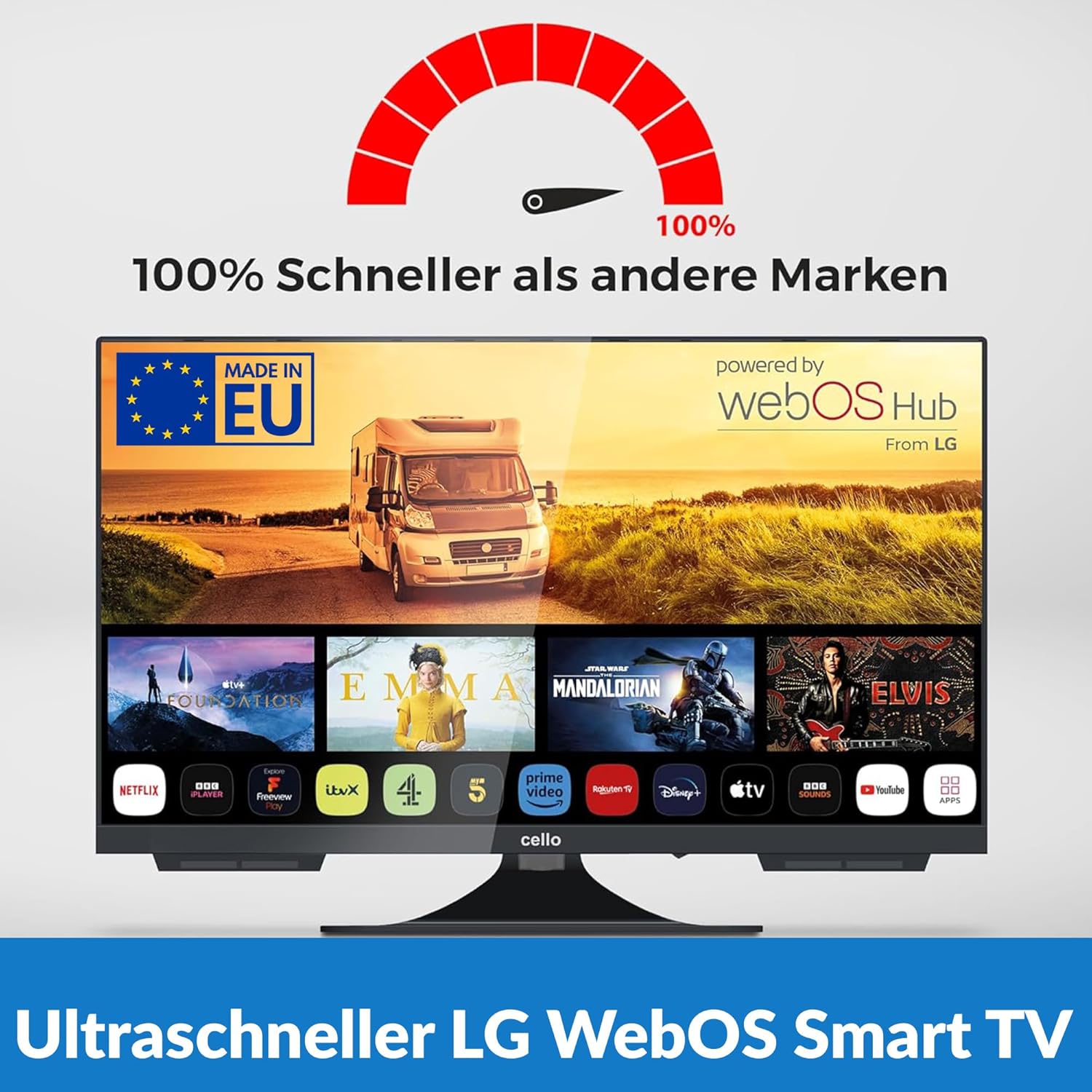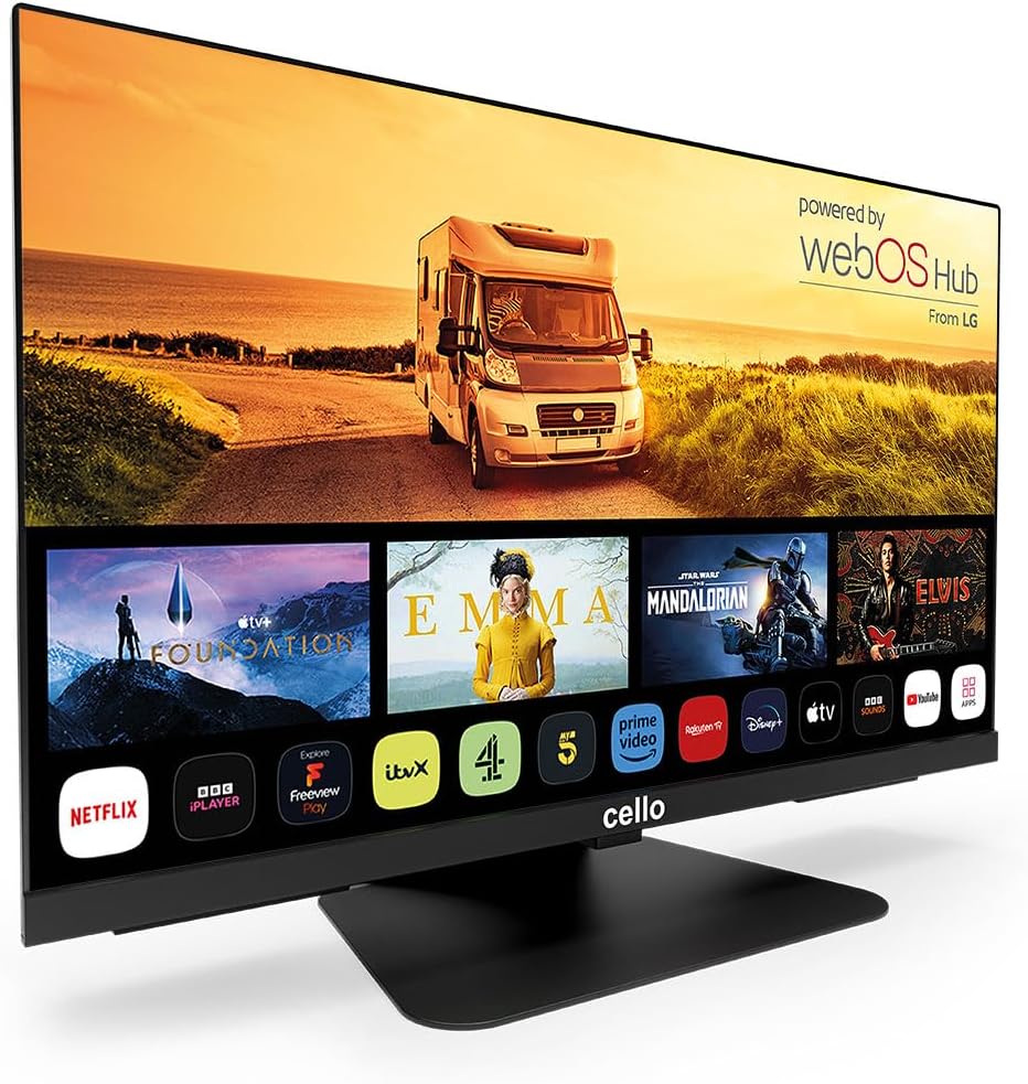Cello C2224WS 12-волтов 22-инчов пътнически смарт безрамков телевизор с ултрабърза WebOS, Freeview Play, FreeSat, Pitch Perfect високоговорител, Bluetooth, Netflix, малък телевизор за кемпери и камиони