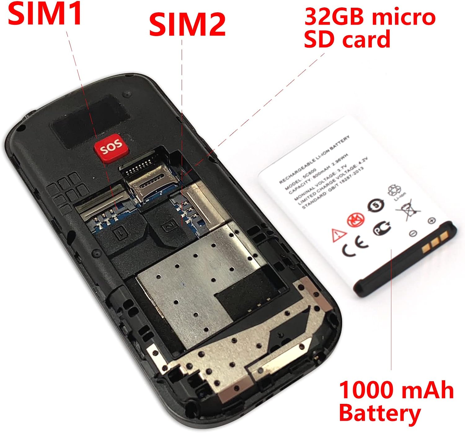 • Мобилен телефон за възрастни хора без договор: този мобилен телефон с бутони е мобилен телефон с бутони без договор. Можете да изберете пакета, който ви подхожда от мобилните оператори. Този мобилен телефон поддържа всички европейски 2g мрежи и е подходящ за осъществяване на разговори и изпращане на текстови съобщения, но не и за достъп до интернет. Можете да използвате две SIM карти, което ви позволява да спестите пари, особено в чужбина.