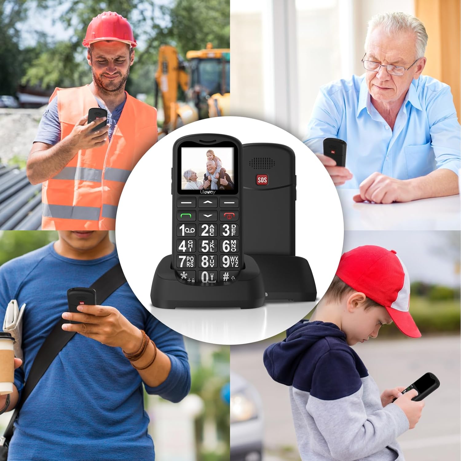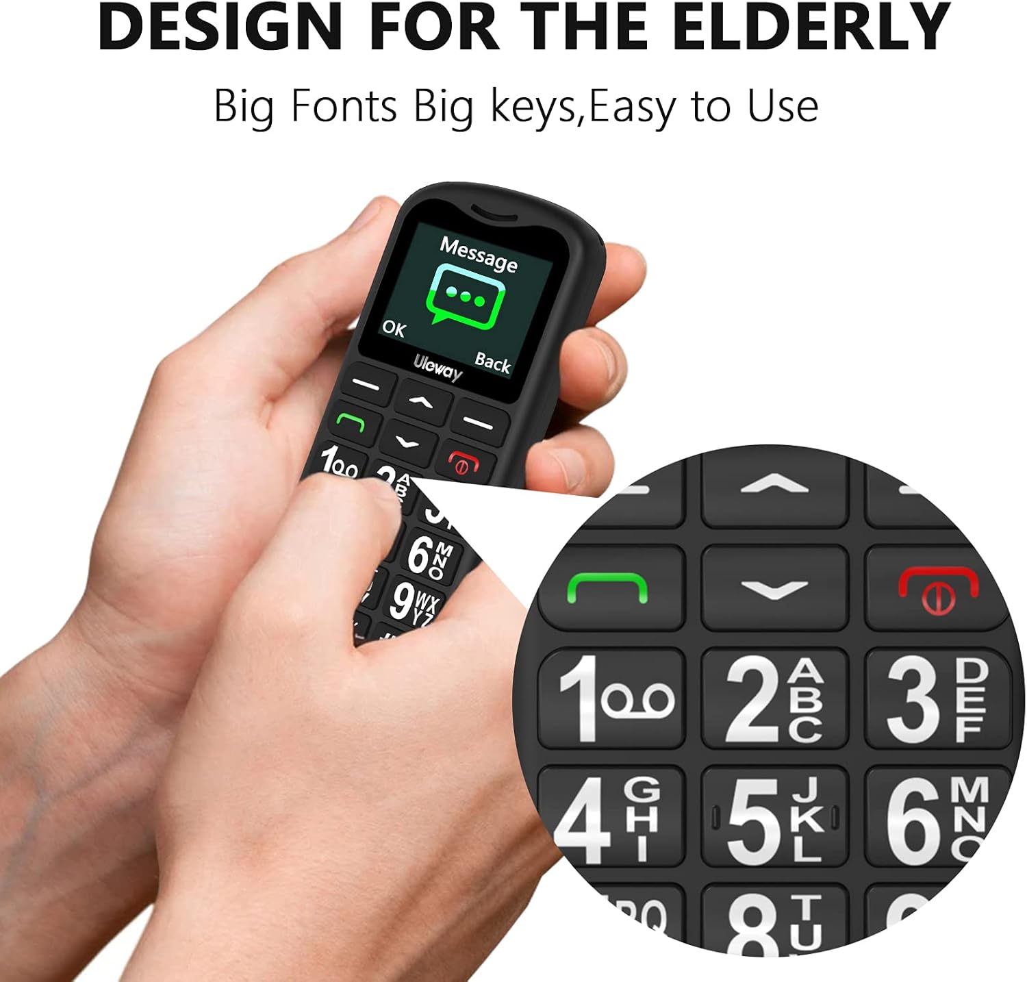 • Мобилен телефон с големи бутони за възрастни хора: мобилни телефони за възрастни хора, голям 1,7-инчов дисплей, операционната система има по-големи шрифтове, по-ясни икони на менюто, удивително висока сила на звука и ясни високоговорители. Разполага с аудио, видео, Bluetooth, FM аудио, камера, калкулатор, будилник, календар. Може да съхранява 100 записа в телефонния указател. Много подходящ е за възрастни хора, деца и хора с увредено зрение.