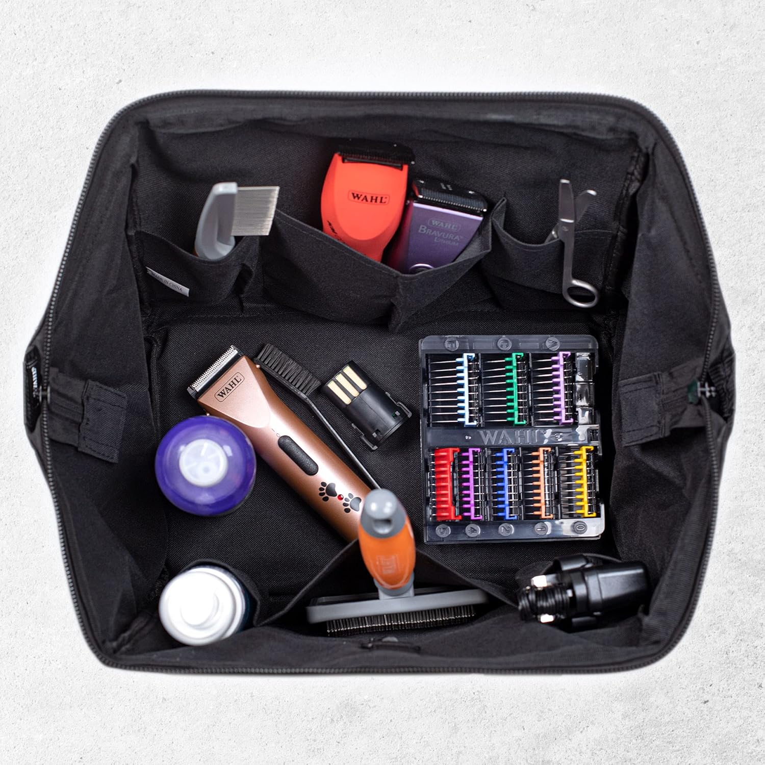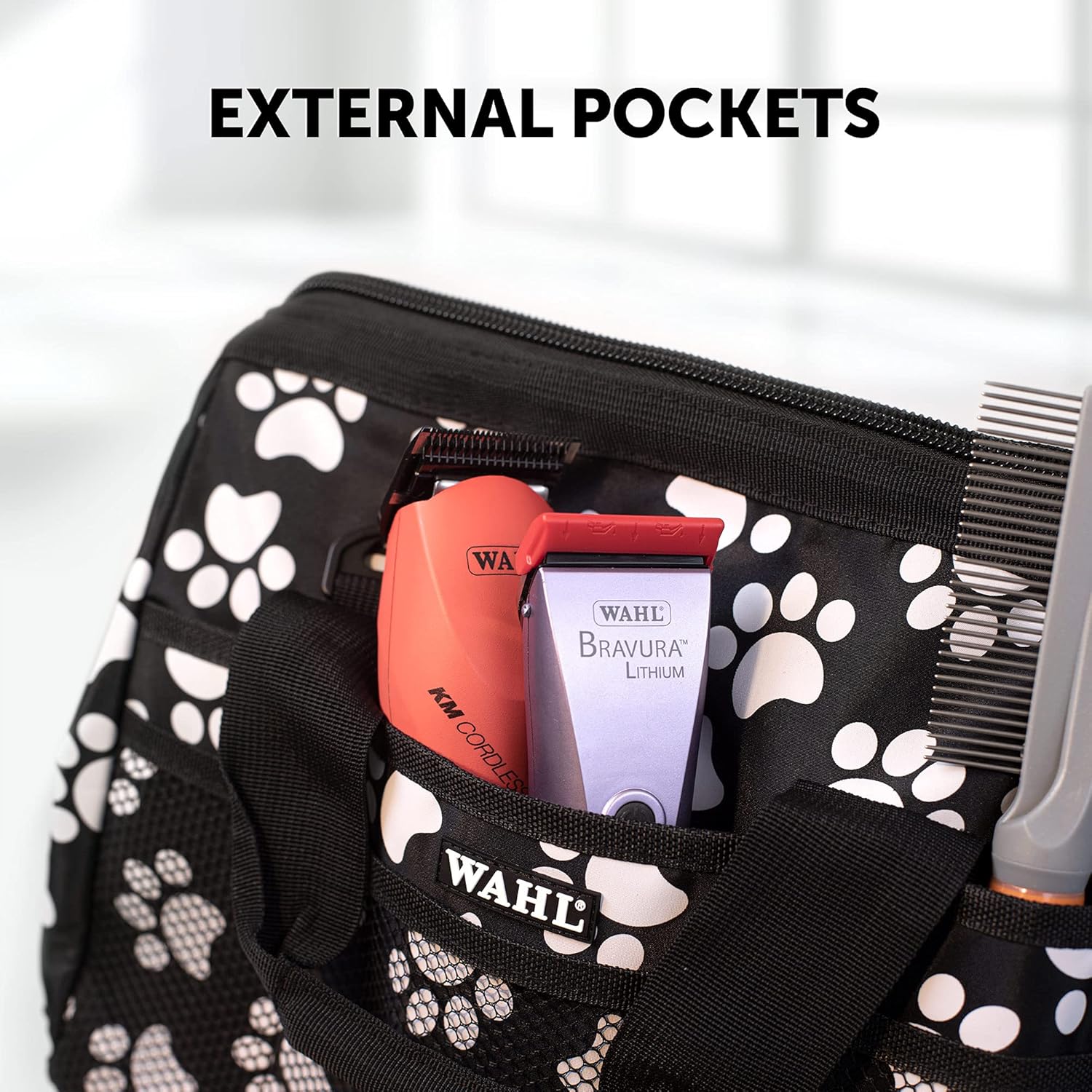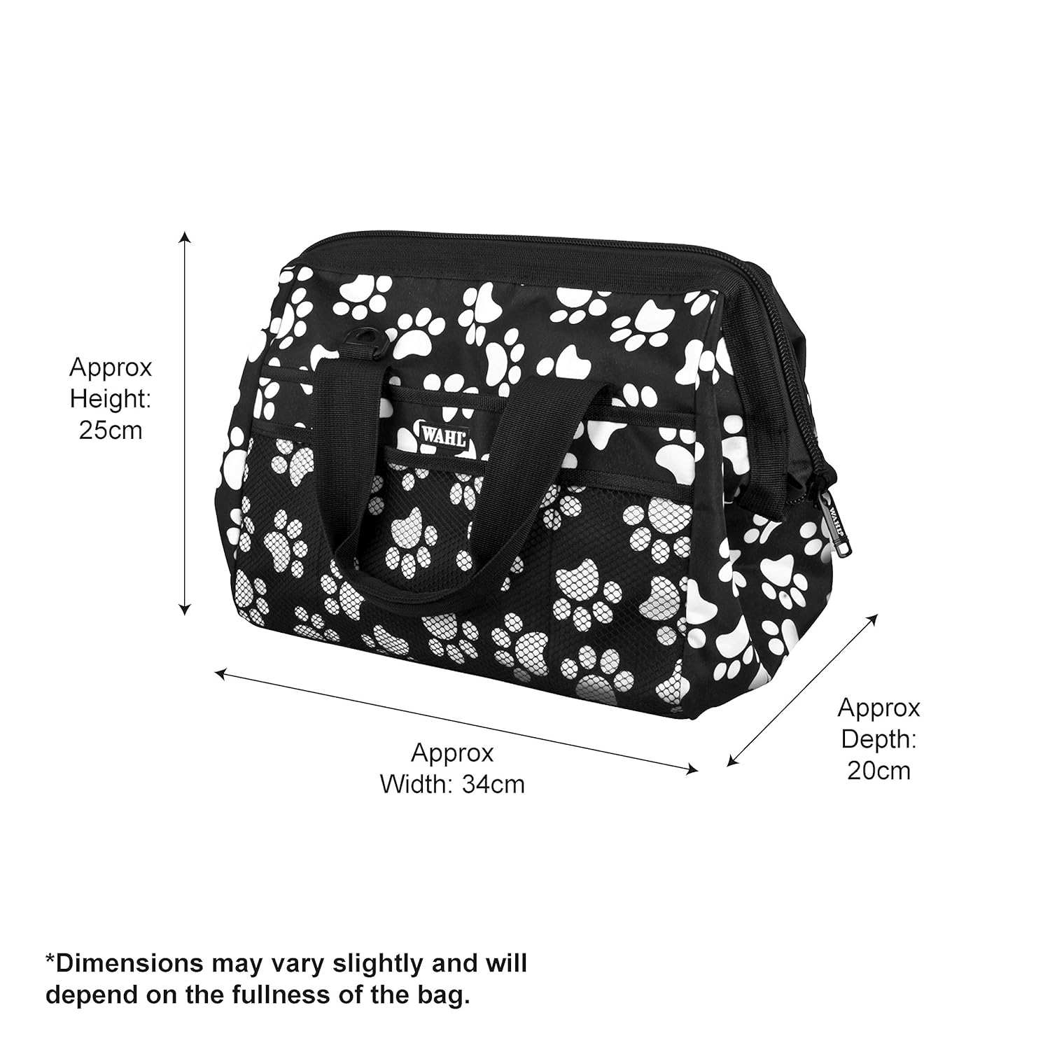 Усмихнете се на лицето на всички с чантата за груминг Wahl Paw Print. Тази чанта за инструменти за груминг на домашни любимци е голяма и има широк отвор за инструменти и аксесоари. Тя е водоустойчива с 6 вътрешни джоба и външни джобове от двете страни, идеални за съхранение на машинки за подстригване, тримери, четки и други. Проектирана с подвижна и регулируема презрамка, която позволява удобно носене на чантата.