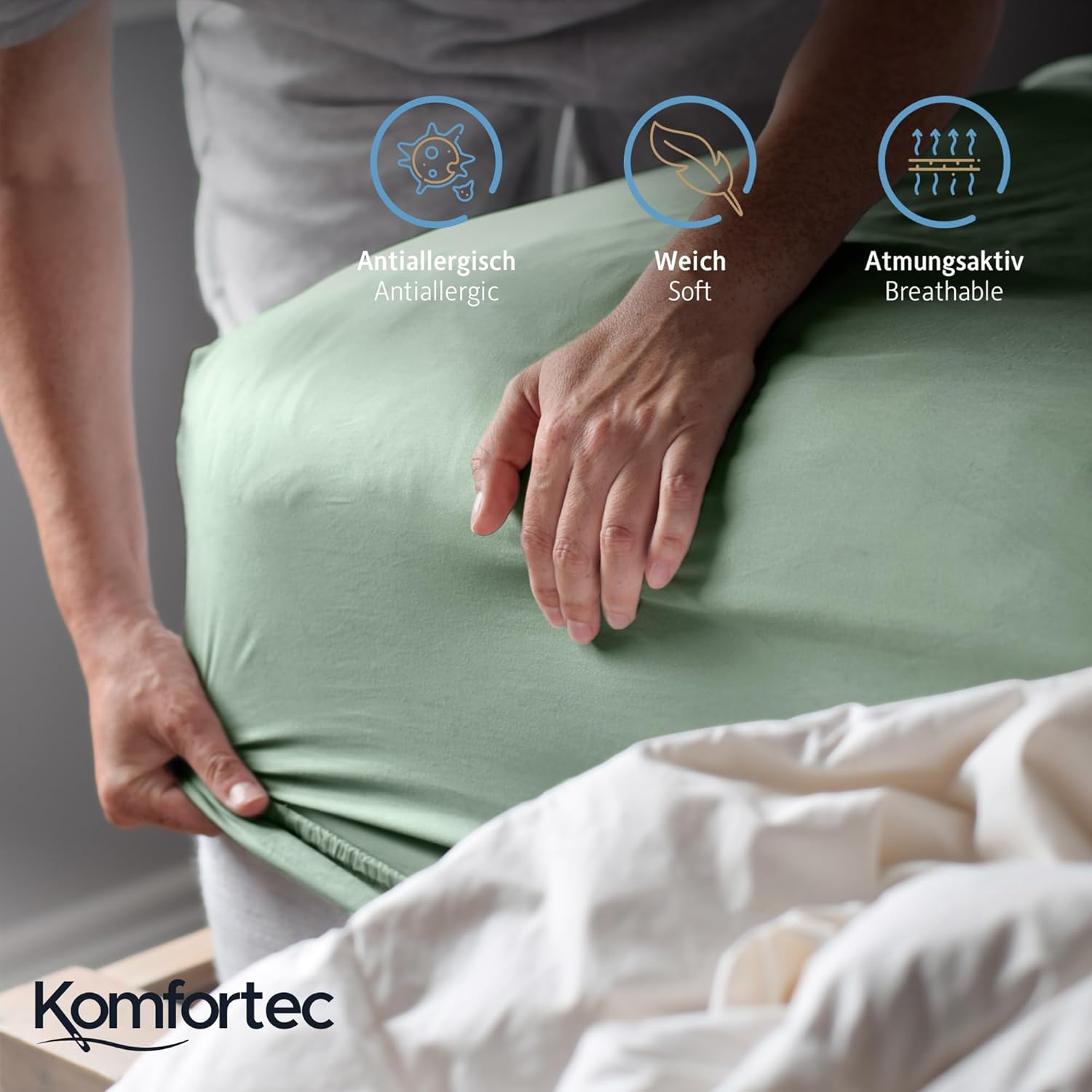 Благодарение на перфектната си форма и елегантен външен вид, чаршафите с пристягане Komfortec пасват идеално на вашето легло. Пасват идеално на всички легла с ширина между 15-25 см.