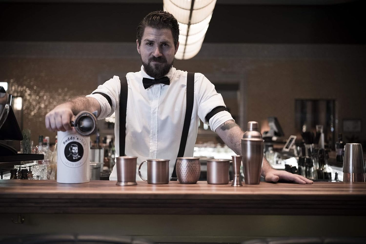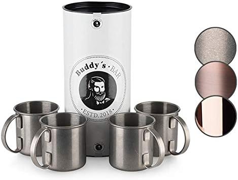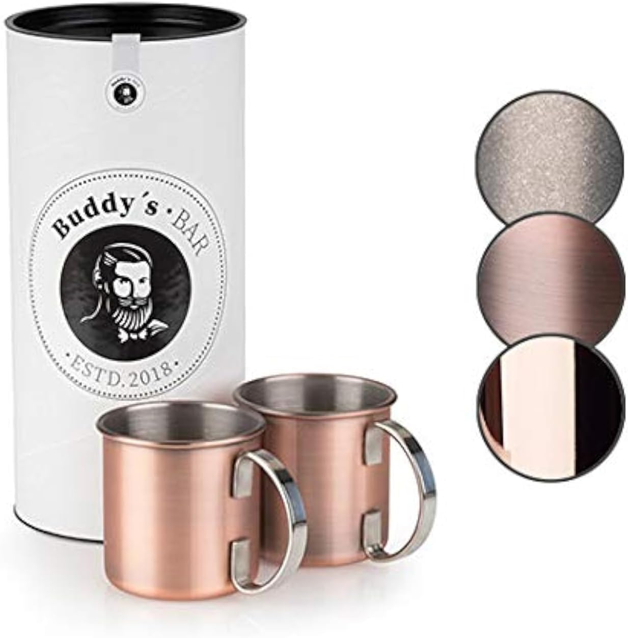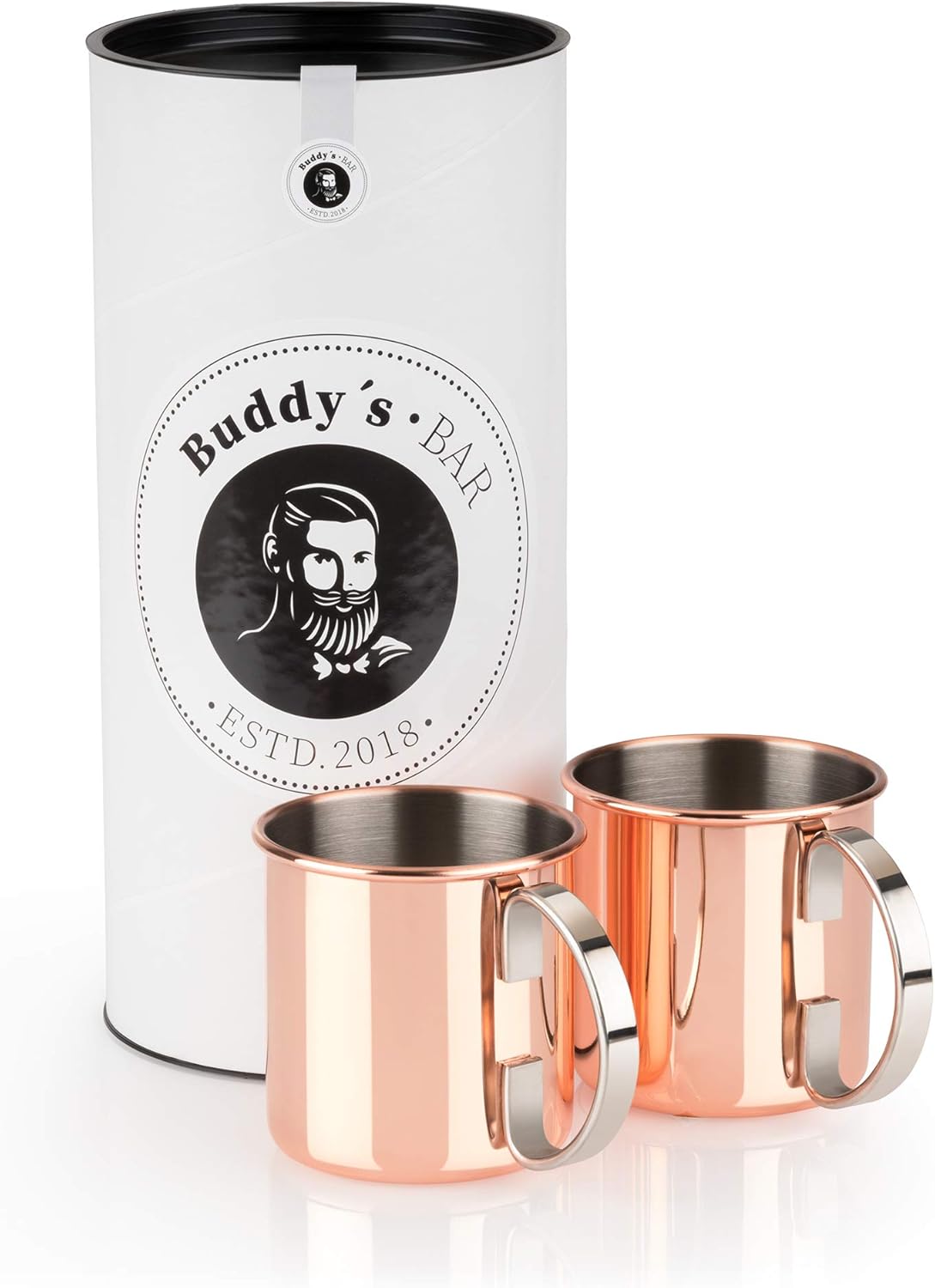 Die Buddy’s Bar Moscow Mule Becher ermöglichen es Dir diesen Cocktail in dem authentischen, coolen Look zu servieren, für den dieser angesagte Cocktail bekannt ist. Die Becher bleiben lange Zeit eiskalt und die kupferbeschichtete Außenwand beschlägt in Sekundenschnelle. Cheerio!