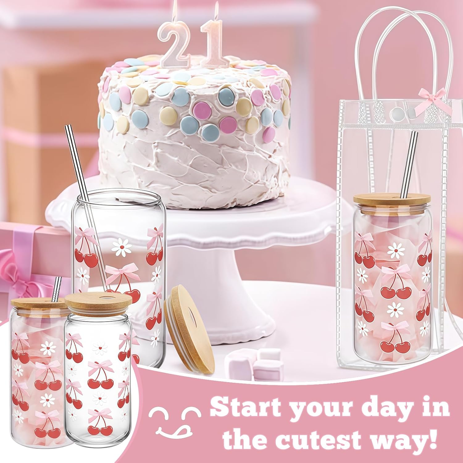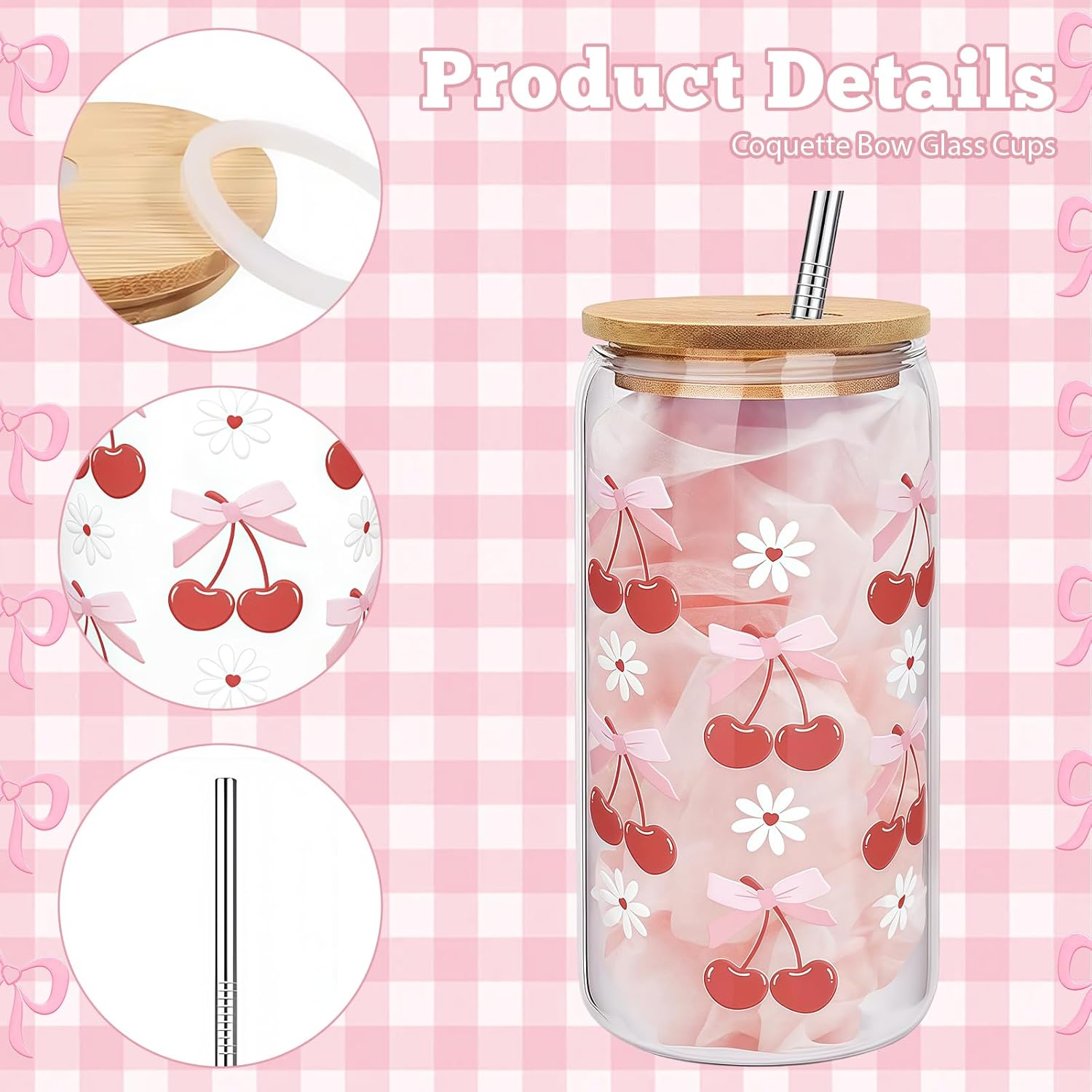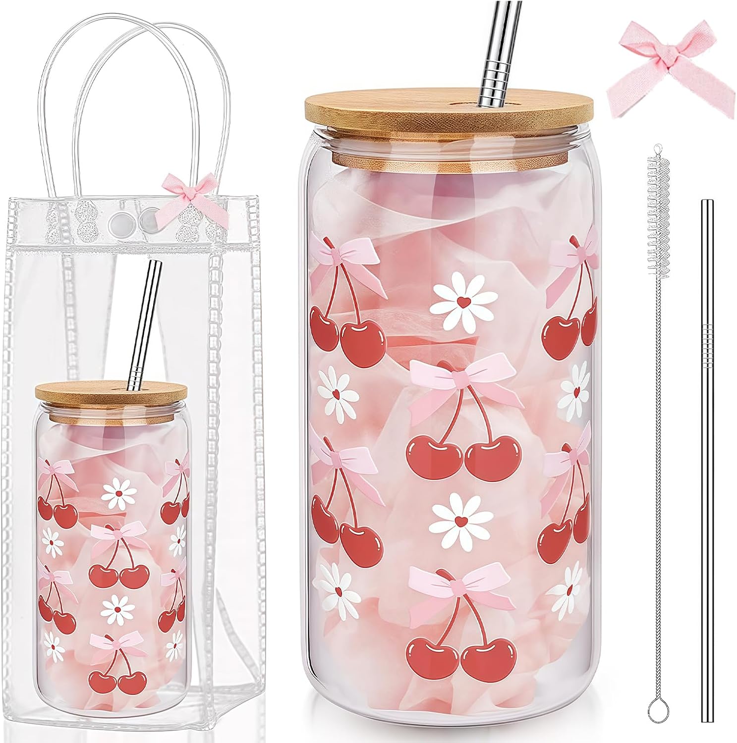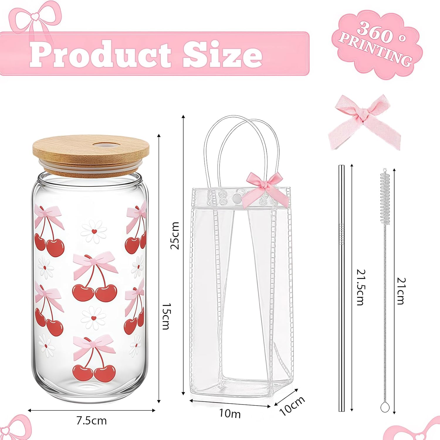 1. ВИСОКОКАЧЕСТВЕНА СТЪКЛА С ЧЕРЕША: Изработена от висококачествено боросиликатно стъкло – здрава, прозрачна и безопасна за студени напитки като кафе, сок или смутита.