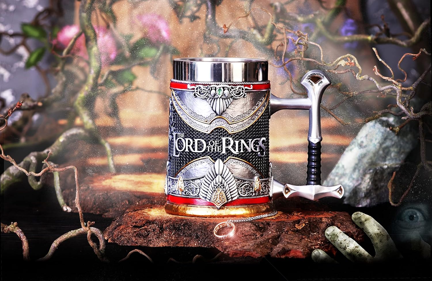 Дръжките на тази бирена халба и бокал са оформени като дръжката на Нарсил, дългият меч, държан от крал Елендил по време на Войната на Последния съюз и използван от сина му Исилдур, за да отсече Единствения пръстен от ръката на Саурон. Детайлите около ръба отразяват тези на Пръстена на Барахир, а отстрани е изобразено Бялото дърво на Гондор. Неговата верижна ризница и броня оформят фона, докато думите „Властелинът на пръстените“ са видно показани на преден план. Това изящно изработено произведение е отлято от най-фината елфическа смола, преди да бъде експертно ръчно рисувано.