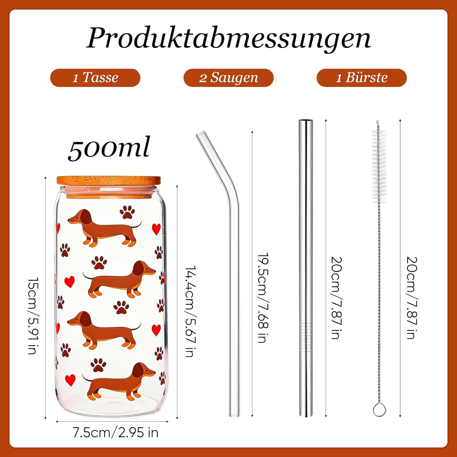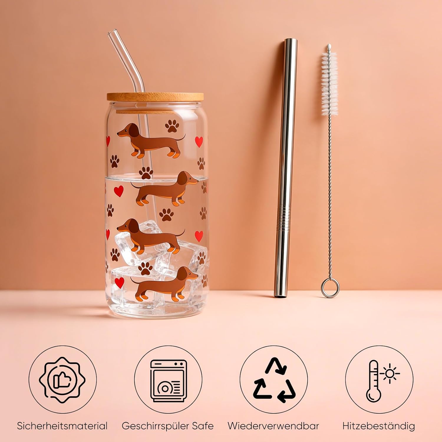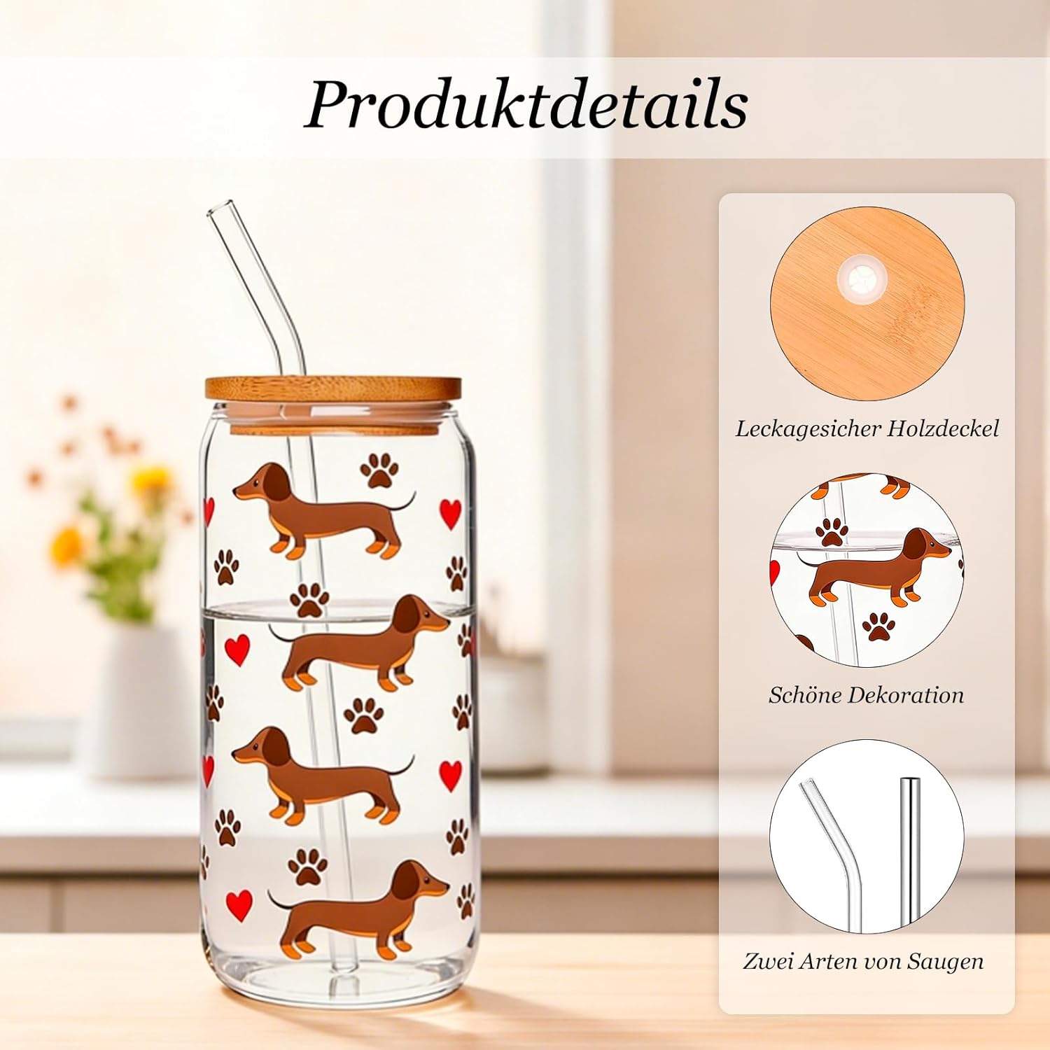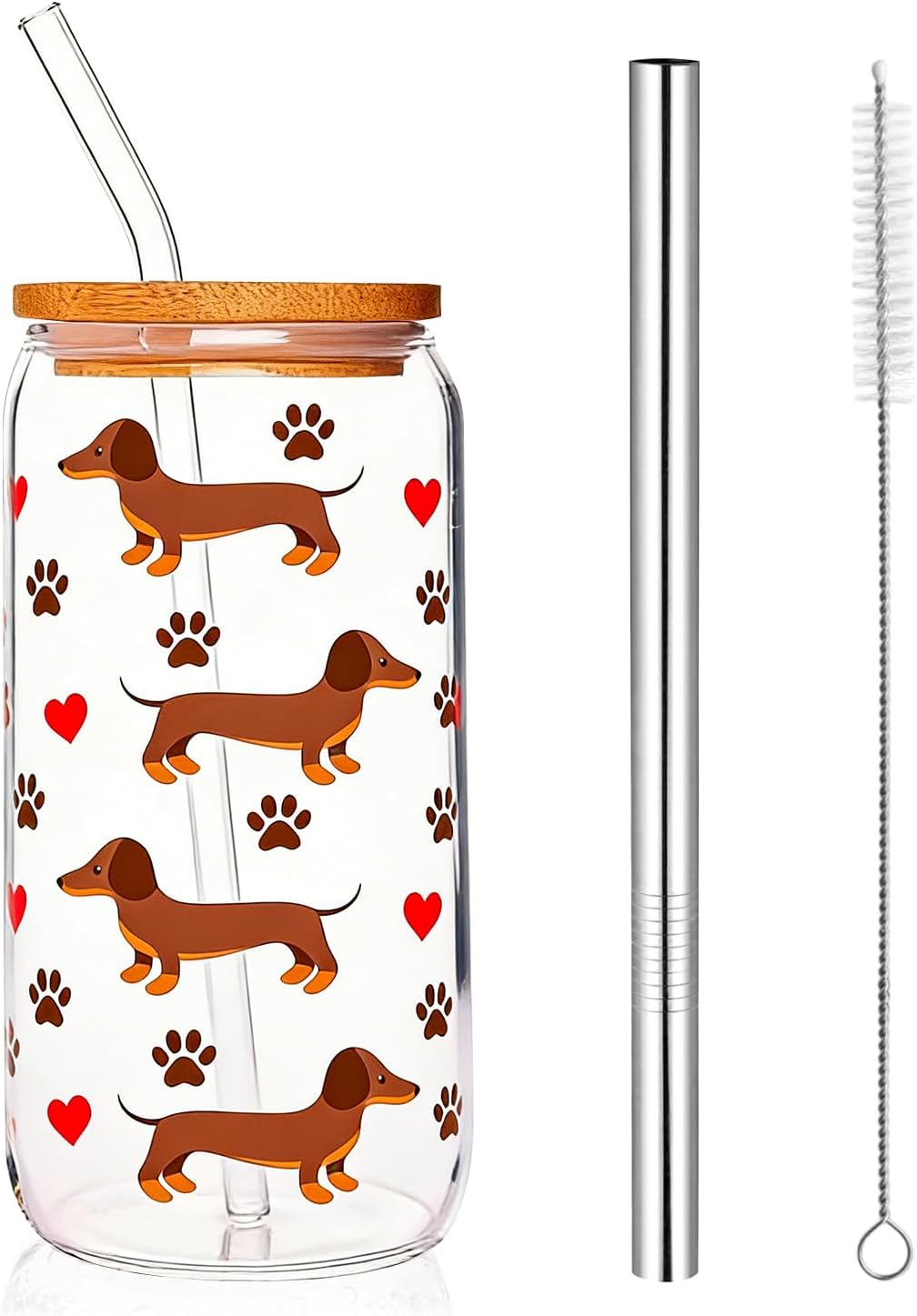 PIujsym Чаша за Дакел - Чаша за пиене 500 мл с бамбуков капак и сламки - Сладък дизайн с Дакел за ледено кафе и мача Подаръци за Дакел за жени и собственици на кучета