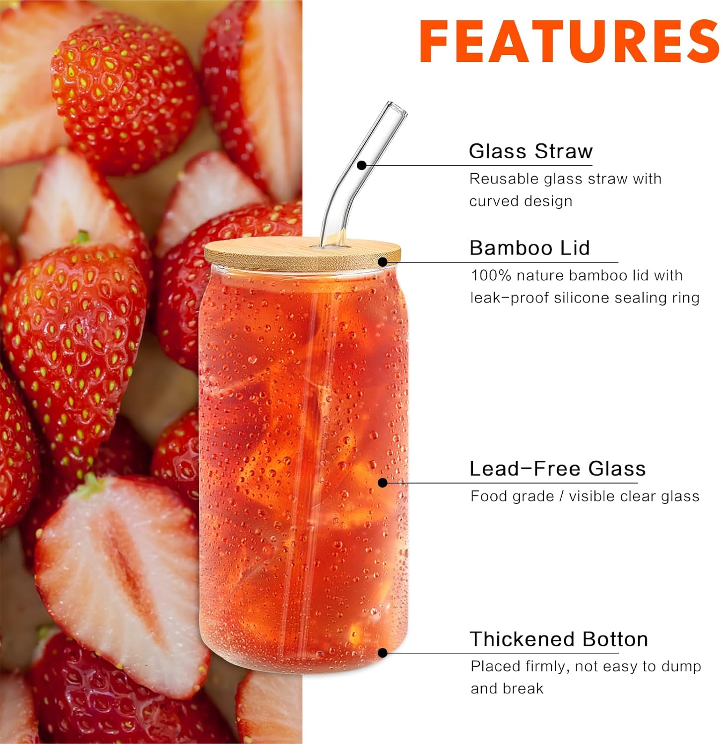 • 【Хранителен и подобрен бамбуков капак】Тази чаша за пиене с капак и сламка е изработена от висококачествено, прозрачно, безопасно за храна боросиликатно стъкло. Подобреният бамбуков капак може да се използва без сламката, точно както обикновена чаша с напълно запечатан капак. Тя може да издържи на резки температурни промени между -56°C и 100°C (-68°F и 212°F), осигурявайки стабилност и издръжливост.