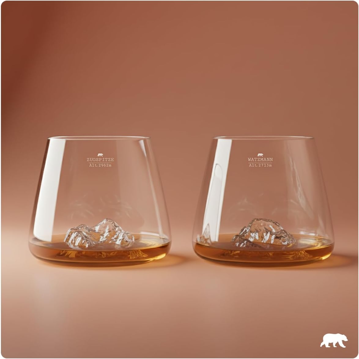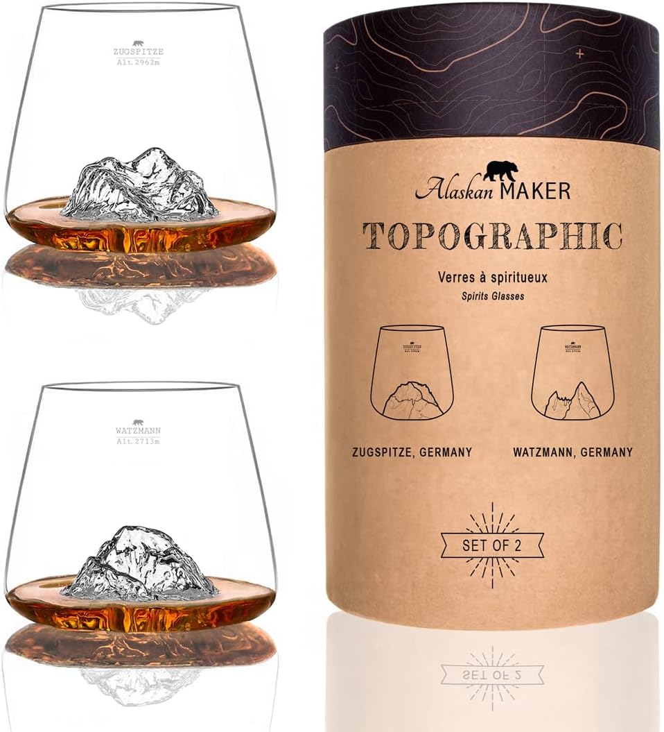 Чаши за уиски Alaskan MAKER 350 мл (Комплект от 2) | Висококачествена ръчно издухана кристална чаша с планински релеф | Форма на лале | Spirits TOPOGRAPHIC (Zugspitze & Watzmann)