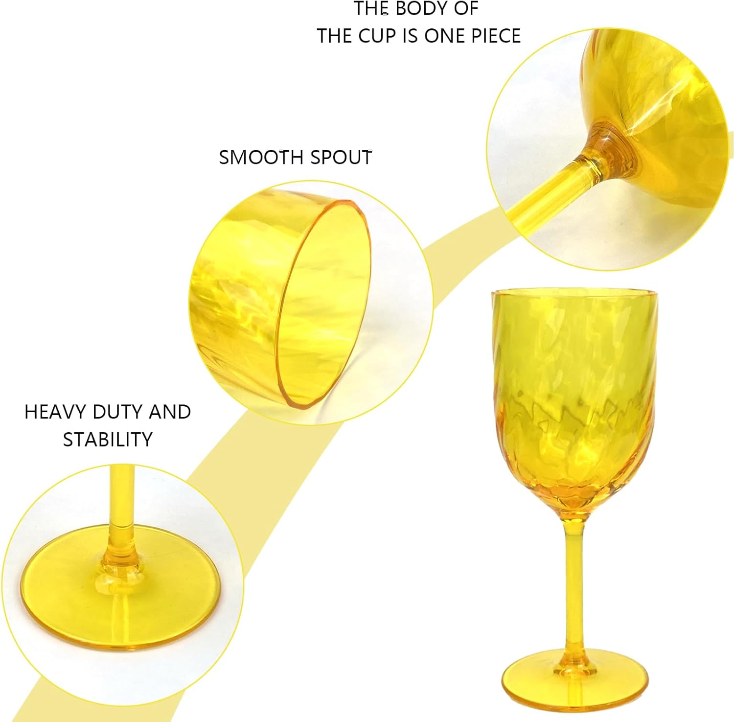 Перфектно, защото вашите чаши за вино са изработени от изключително здрава пластмаса без BPA. Те са кристално прозрачни и изглеждат като стъкло, но няма да се счупят, дори ако дъното им се изпусне.