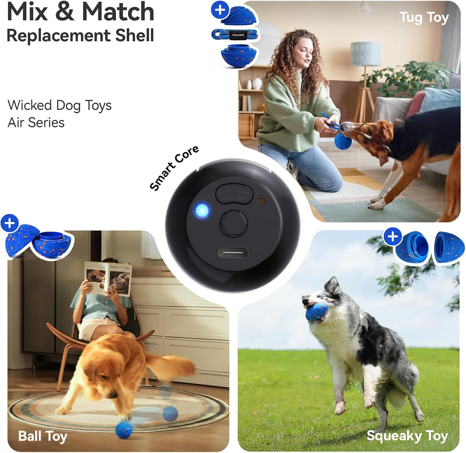 • БЕЗОПАСНО ЗА ДОМАШНИ ЛЮБИМЦИ ИЗДРЪЖЛИВО СМЕНЯЕМО Сменяемата външна обвивка на Wicked Ball Air е изработена от E-TPU, който е супер устойчив на дъвчене и екологичен. Между другото, сърцевините на "Wicked Rugby" (ASIN: B0FFFZ2JZ9) и "Wicked Ball AIR" са съвместими помежду си. Това означава, че е необходимо само да смените обвивката, когато купувате един от двата модела топки Cheerble, за да се насладите на забавните играчки за кучета и на двата модела.