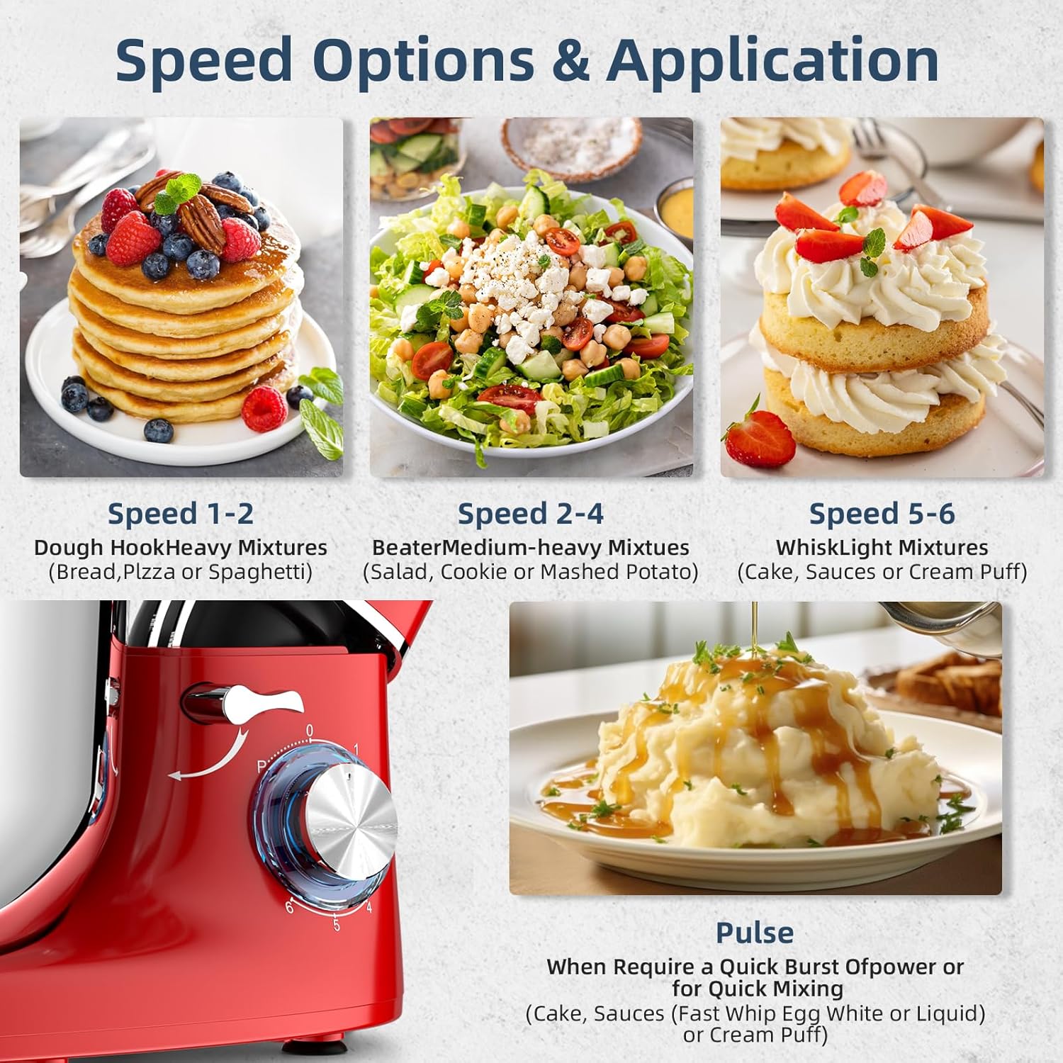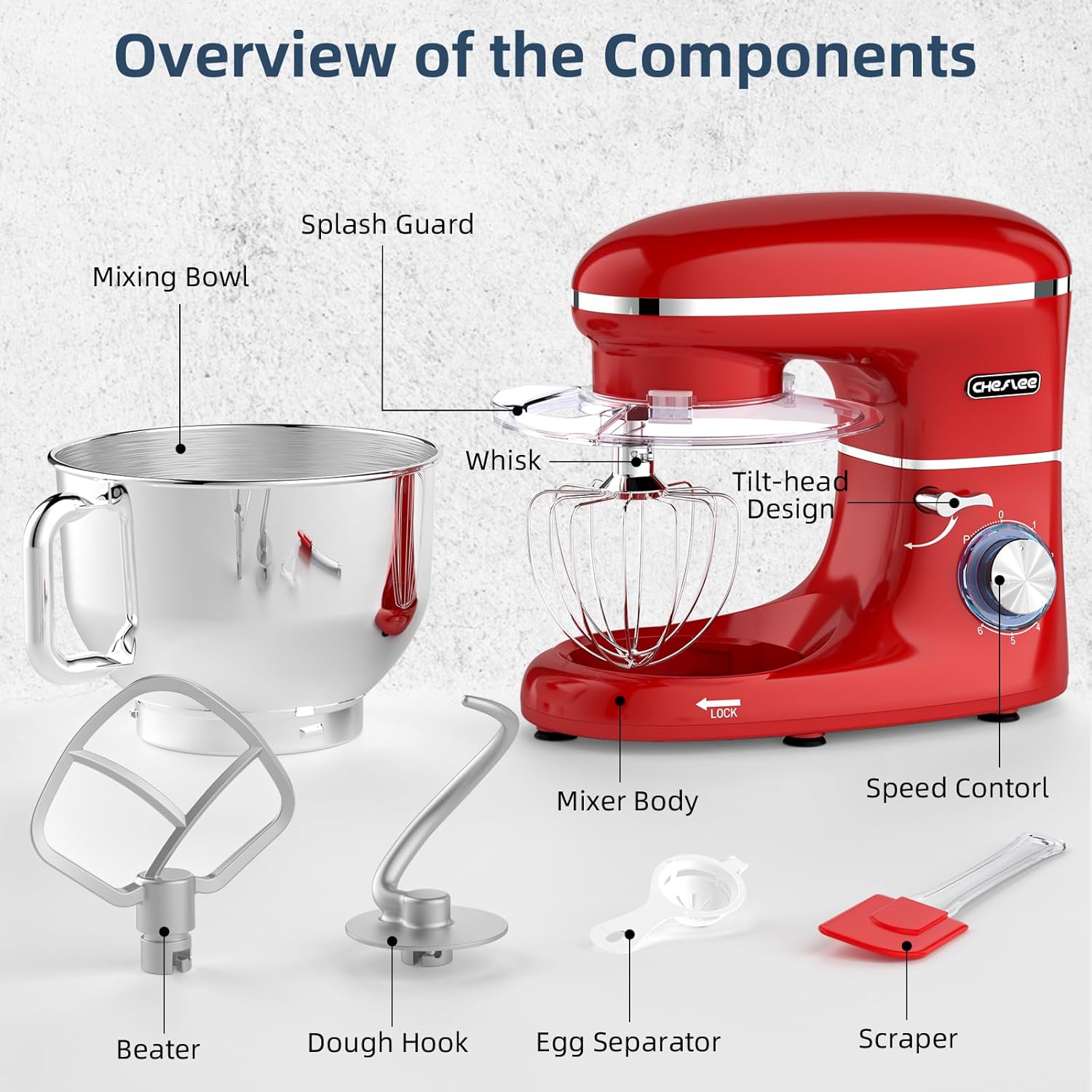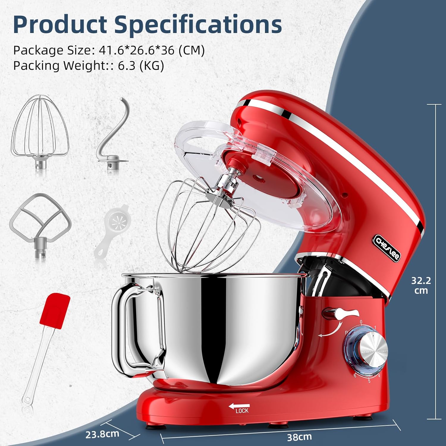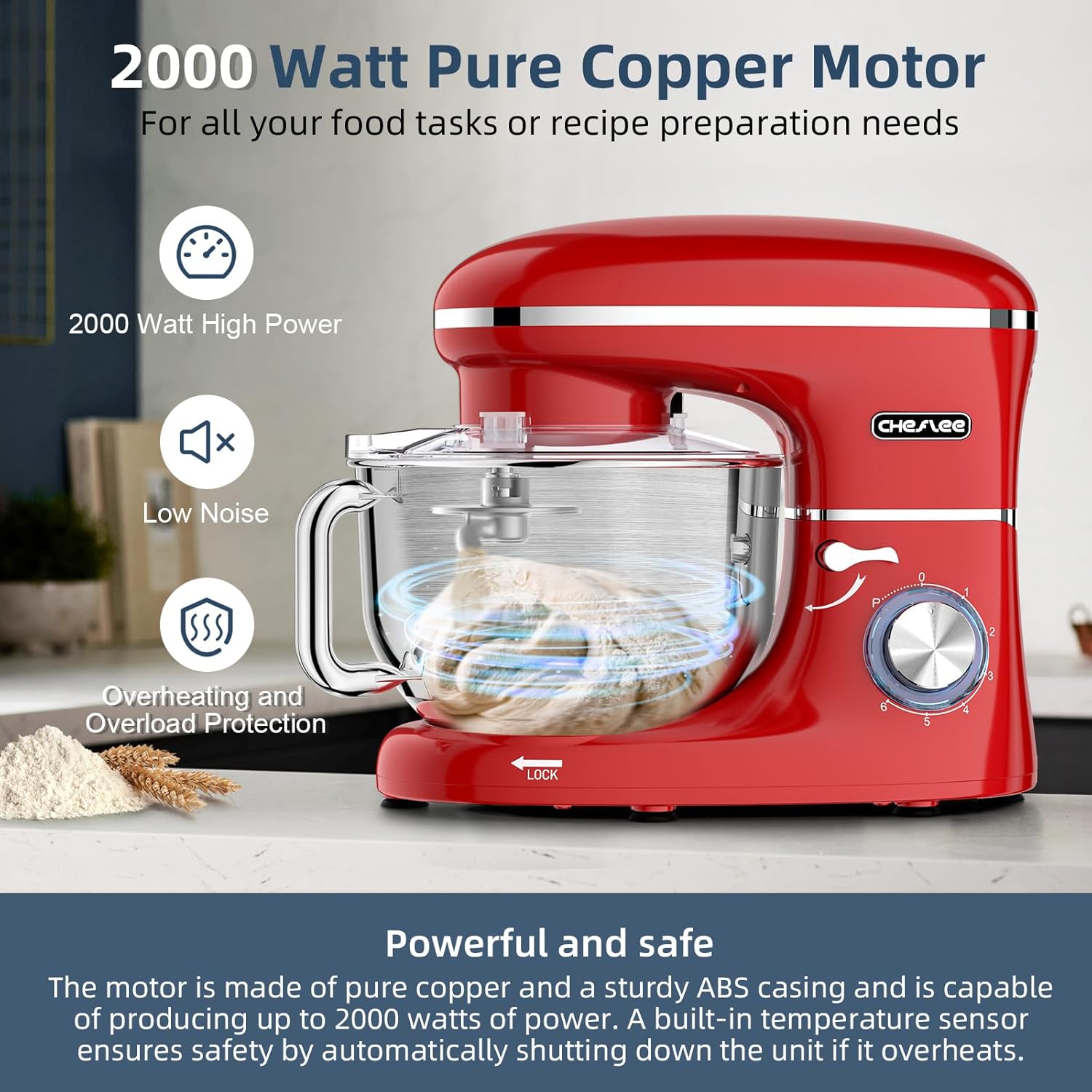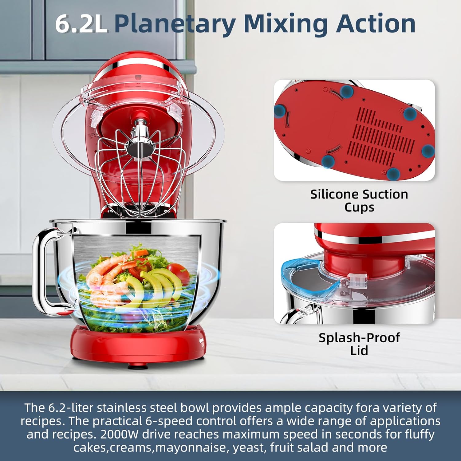 CHeflee Кухненски робот за тесто Машина за месене 2000 W, с купа от неръждаема стомана 6,2 л, 6 скорости с намален шум, с бъркалка, кука за смесване, защитена от пръски машина за месене с кука за тесто