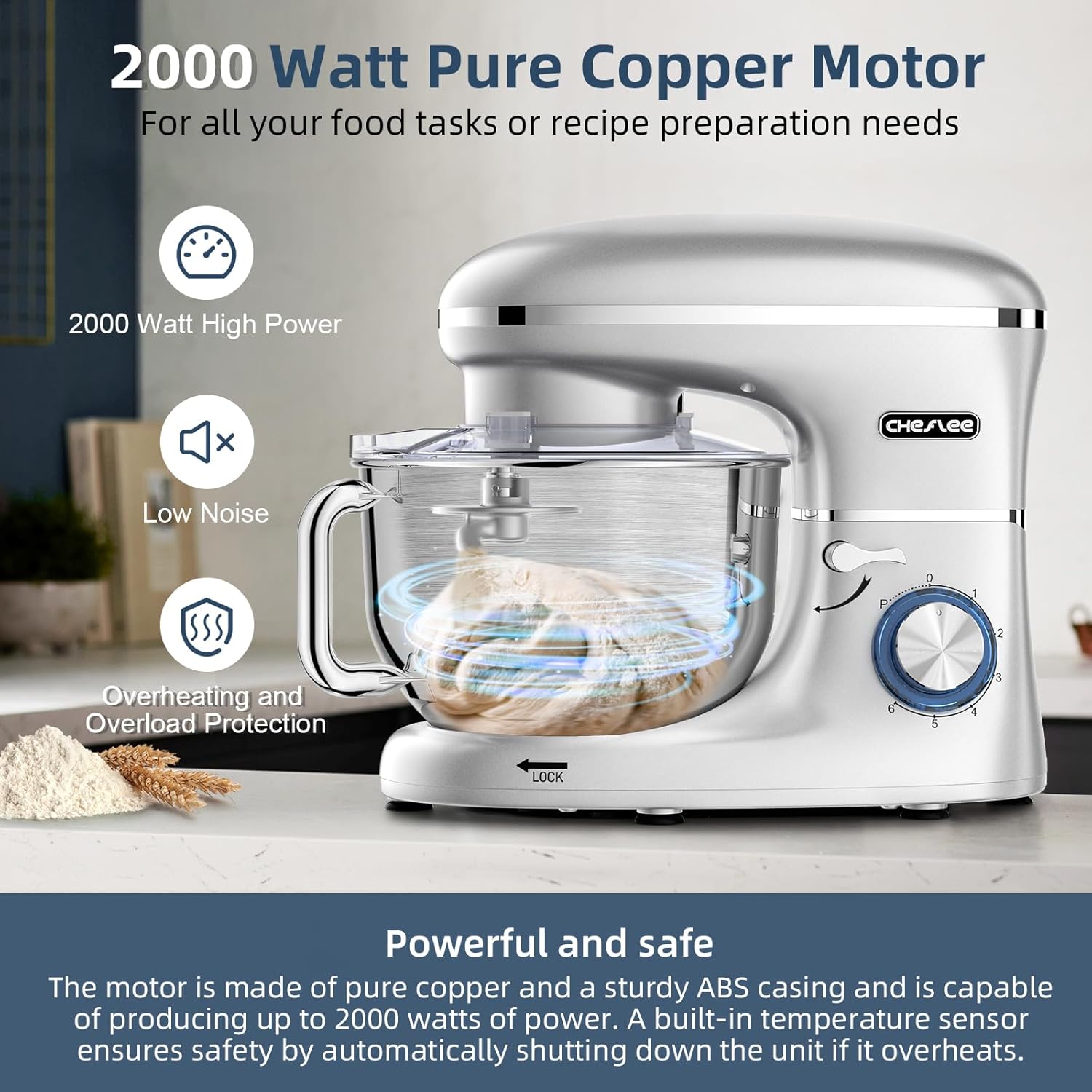 CHeflee Кухненски робот за тесто Машина за месене 2000 W, с купа от неръждаема стомана 6,2 л, 6 скорости с намален шум, с бъркалка, кука за смесване, защитена от пръски машина за месене с кука за тесто