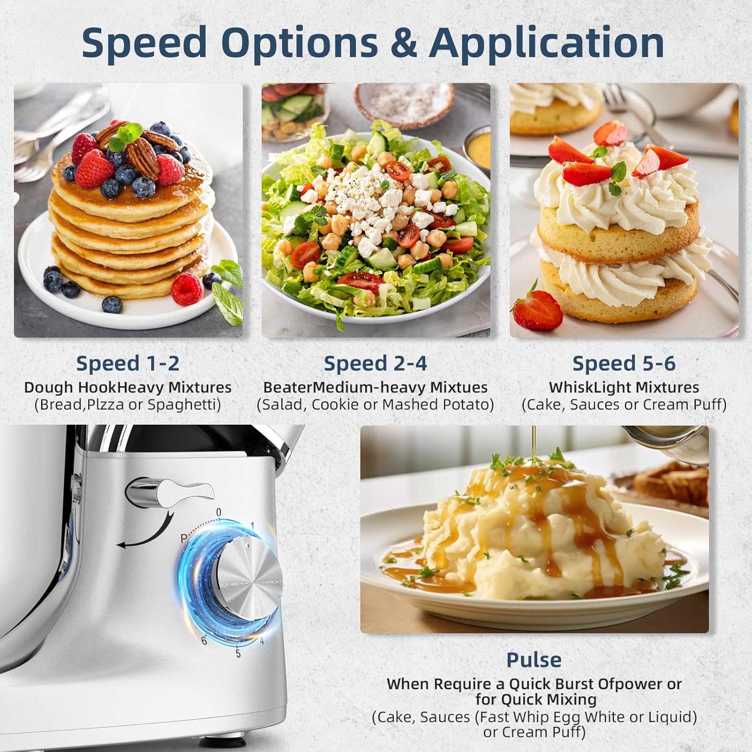 • Мощен и тих мотор: мощен кухненски робот с изключително мощна мощност от 2000 W с 6 настройки на скоростта и импулсна функция, за да се справи дори с най-трудните задачи, независимо дали смесвате мокри и сухи съставки, месите тесто за хляб или разбивате сметана. По-мощен двигател, но тих!