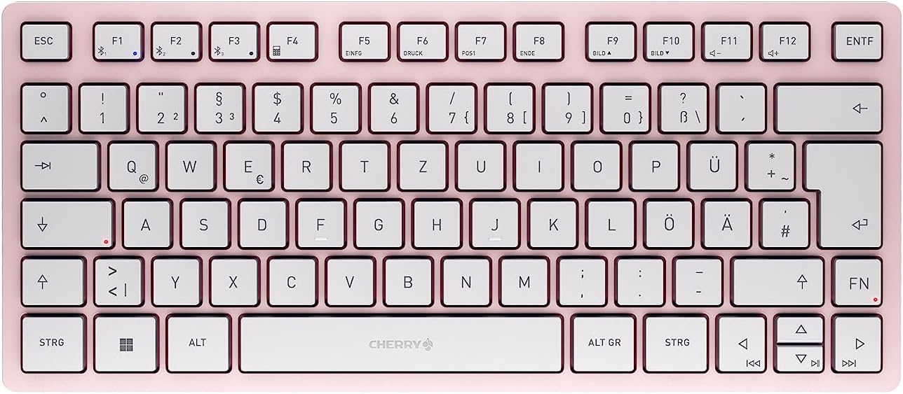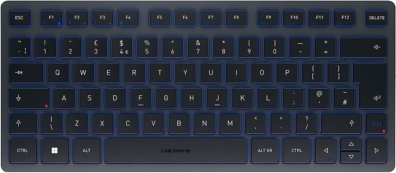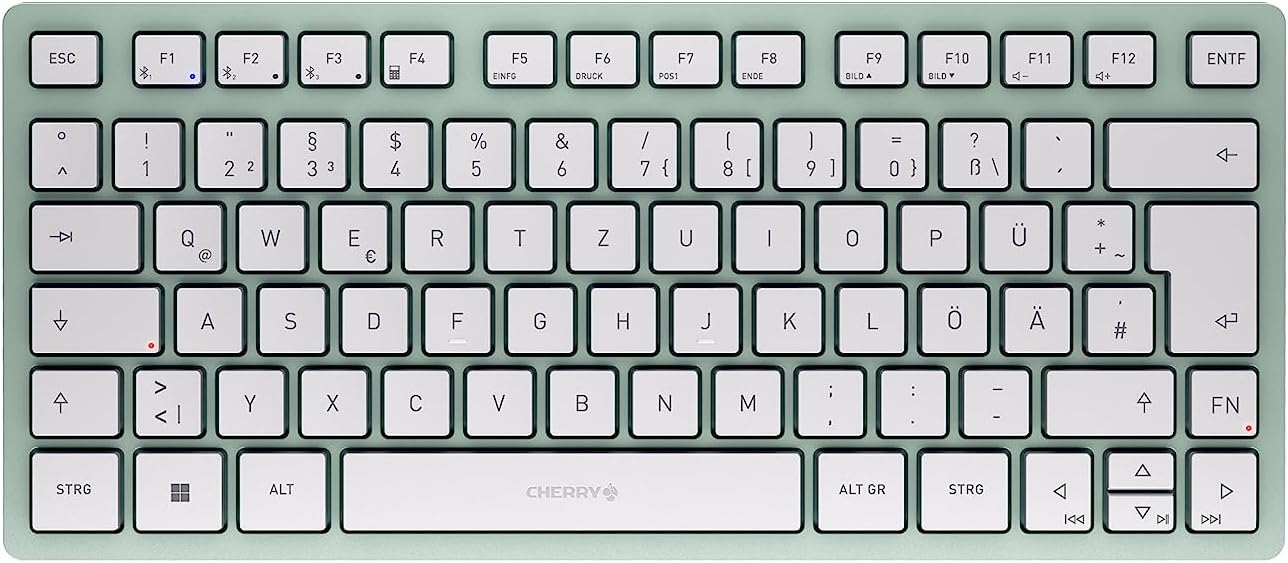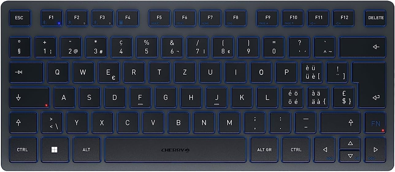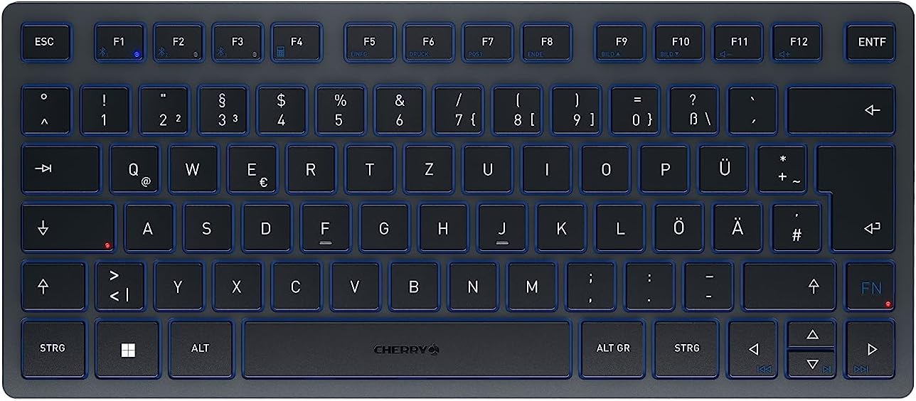 CHERRY KW 7100 MINI BT Компактна клавиатура за множество устройства с 3 Bluetooth канала, немска подредба (QWERTZ), плосък дизайн с калъф за носене, цвят Slate Blue