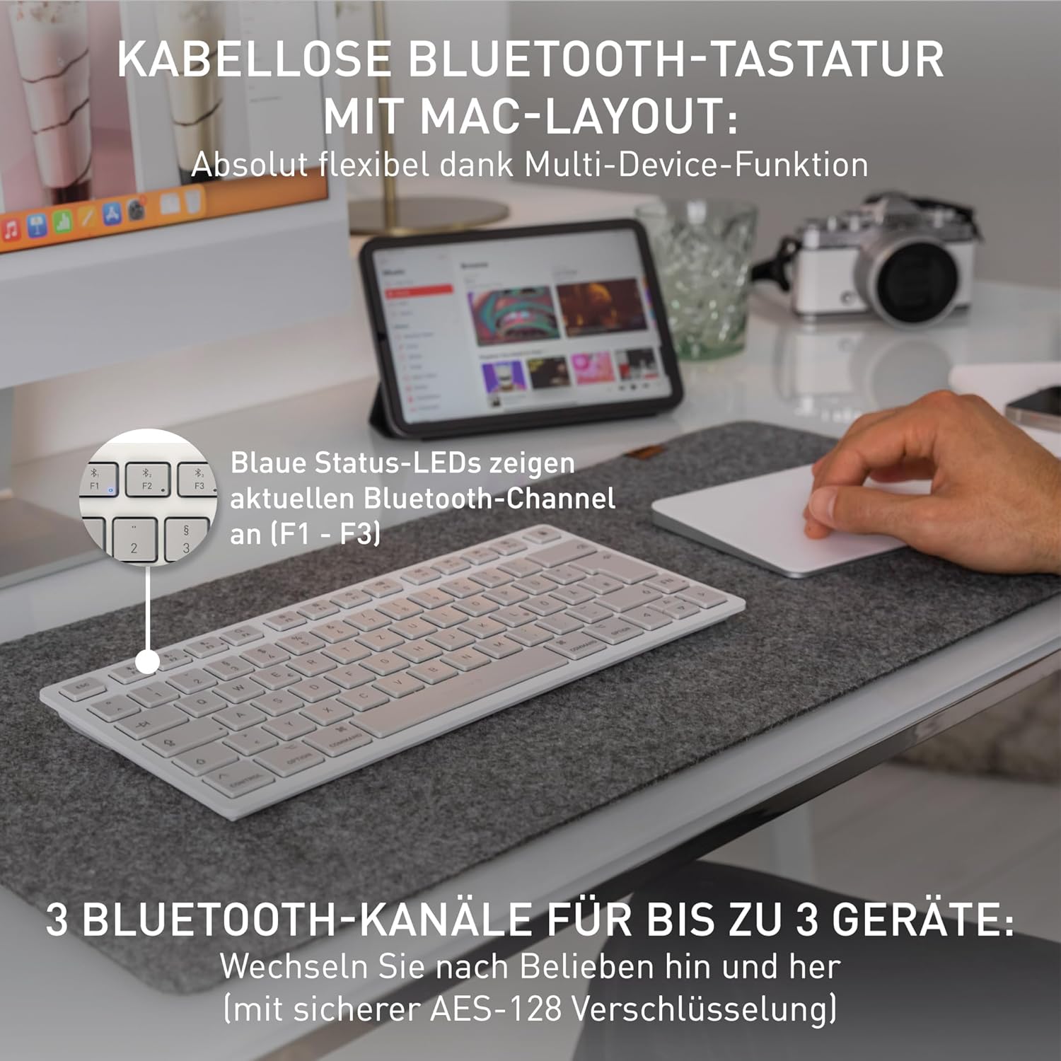 CHERRY KW 7100 MINI BT ЗА MAC, Компактна Mac клавиатура с 3 Bluetooth канала, Немска подредба (QWERTZ), Безжична клавиатура за множество устройства, Лунно бяло