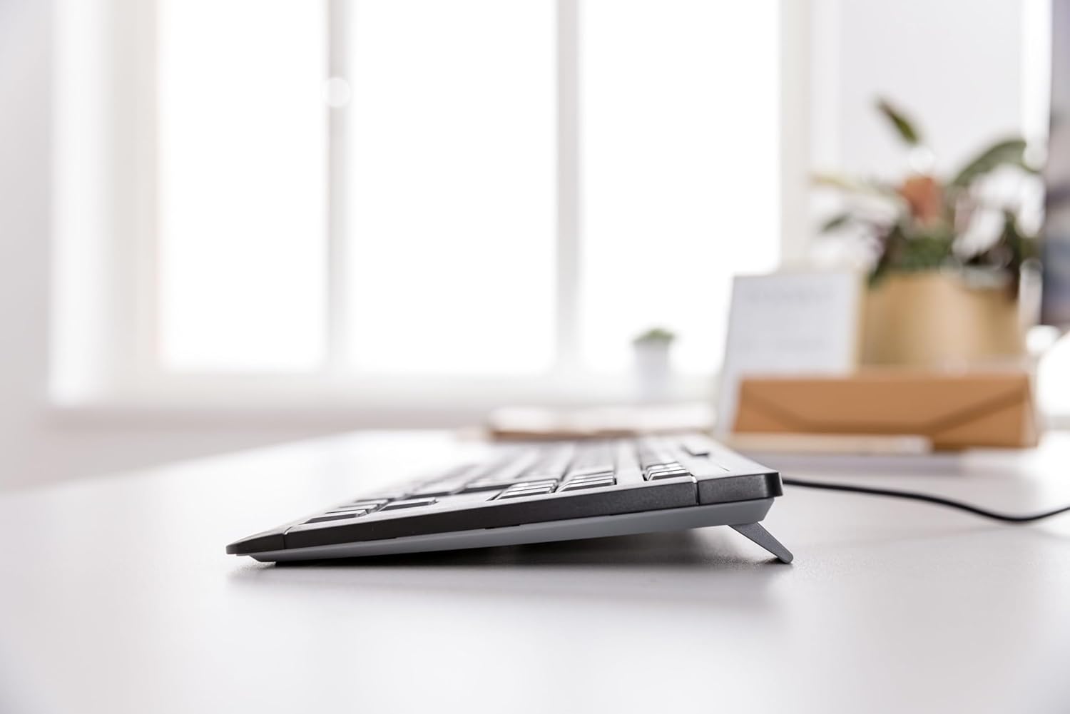 • Висококачествена кабелна клавиатура без цифров блок: Плоска, надеждна и изключително тиха – отличена с екологичния етикет „Blue Angel“ и печата GS „Tested Safety“