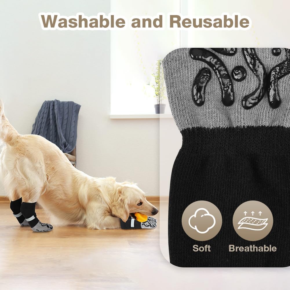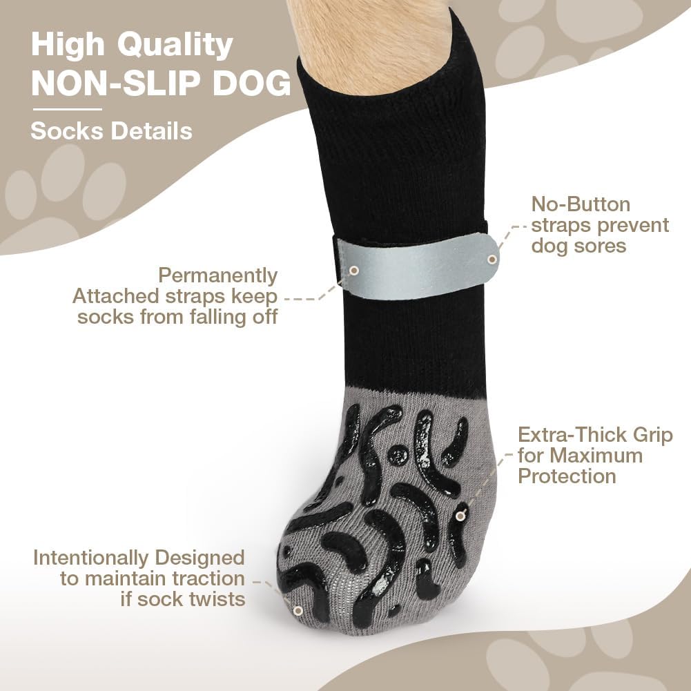 Неплъзгащи се кучешки чорапи, изработени от издръжлив материал с отлична еластичност и висок комфорт при носене, поддържат лапите на вашето куче топли и ги предпазват от остри предмети. Те осигуряват многостранна защита за вашите лапи: от горещи и студени повърхности, от драскотини по мебели и подове и от замърсявания на открито.
