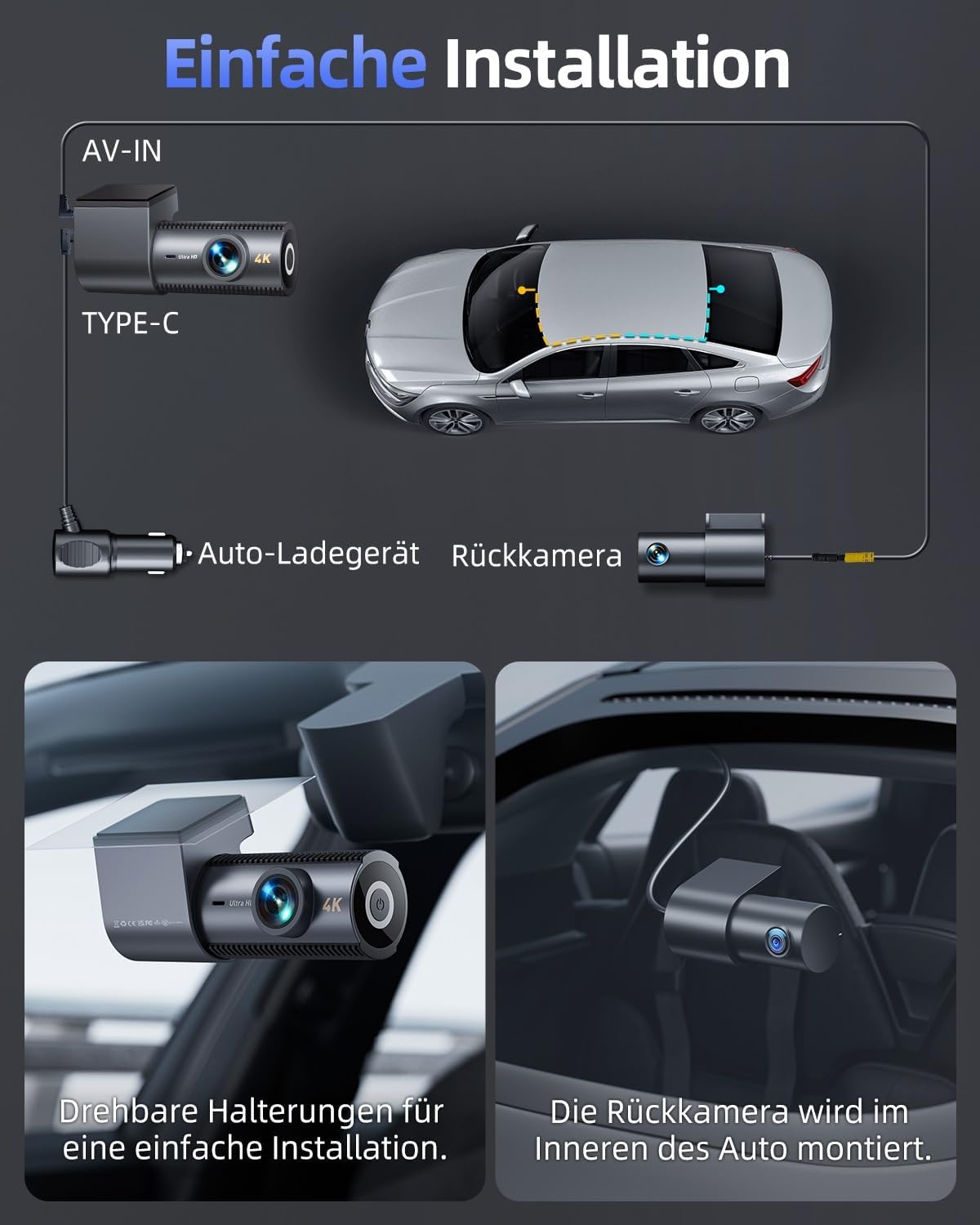 • 【Лесен монтаж и компактен дизайн】Предната камера е подвижна и се завърта до 290°, което прави монтажа и демонтажа лесни. Задната камера се завърта на 360°, предлагайки максимална гъвкавост за всяко превозно средство. Включените аксесоари ви позволяват перфектно да скриете кабелите на видеорегистратора, без да нарушавате интериорния дизайн на автомобила.