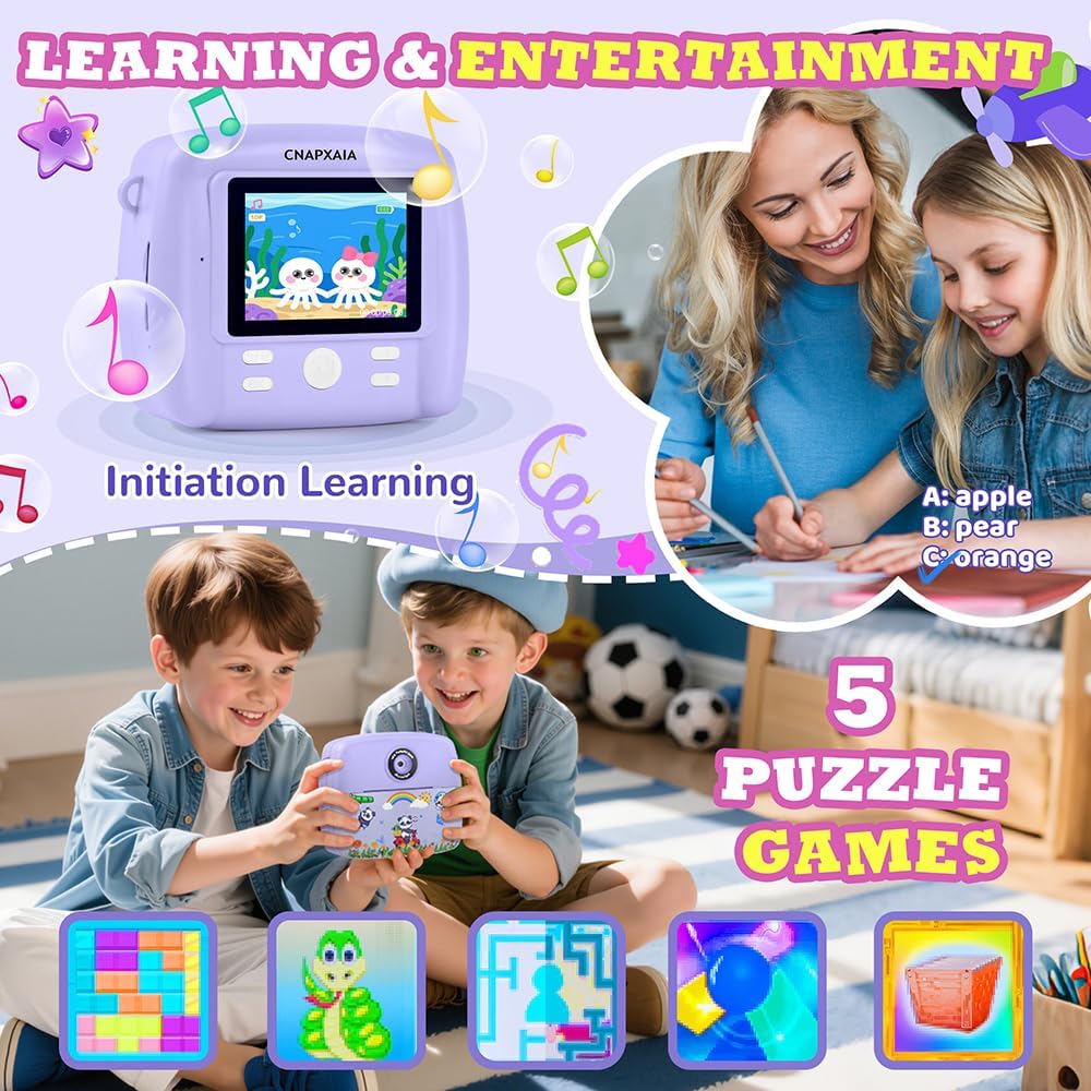 • Безопасен фотоапарат за незабавен печат с усъвършенствана технология за печат: детският дигитален фотоапарат от Cnapxaia използва технология за печат без хартия и мастило, за да гарантира безопасността на малките. Децата могат да украсяват снимки с цветни химикалки, да добавят забавни рамки и да играят 5 игри-пъзели - безопасна играчка и интерактивна играчка, която стимулира въображението.