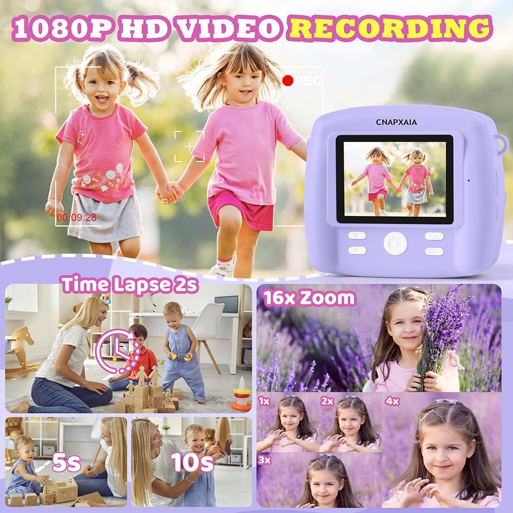 CNAPXAIA Детски фотоапарат, фотоапарат за моментални снимки, 2.4-инчов цифров фотоапарат, моментално отпечатване с 32GB карта и 3 ролки хартия за печат, 16x цифрово увеличение, подарък за момичета и момчета от 3 до 12 години (лилав)