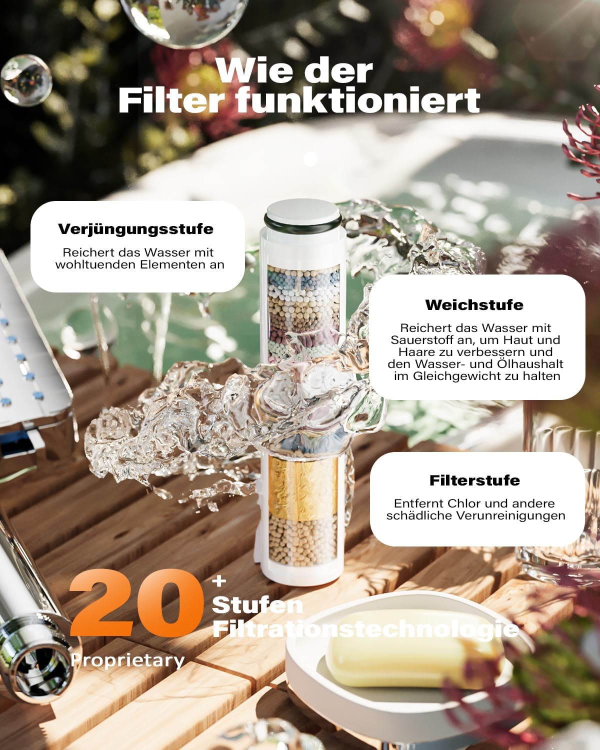 • Подобрена 20-слойна филтърна система: Душът с филтър за твърда вода и маркуч има 20-слойна, мощна филтърна система. Филтърният елемент е изработен от висококачествен KDF, калциев сулфит, активен въглен, витамин C и минерални топчета, които могат ефективно да премахнат остатъчния хлор и тежки метали (олово, живак, никел, хром) и други замърсявания и вредни вещества, спомагайки за възстановяване на здравето на кожата и гладкостта и мекотата на косата. Сменяйте филтъра на душа на всеки 3-4 месеца или при ниско водно налягане.