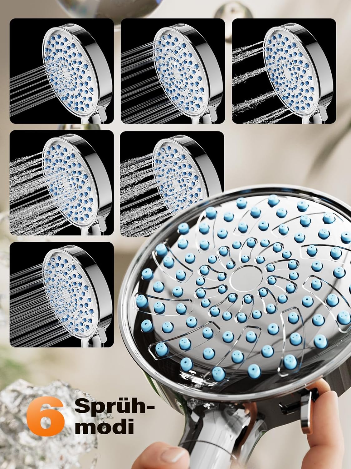 • 6 функции за пръскане: душовата глава с филтър има 6 вида струи: дъжд, масаж, мощна струя, окислителна струя и режим на смесване. Чрез завъртане на лопатката на душовия панел можете лесно да превключвате между различните режими, които желаете. Идеална за ежедневно миене на коса, нежен душ, масажиране, къпане на деца или домашни любимци, почистване на баня и други.