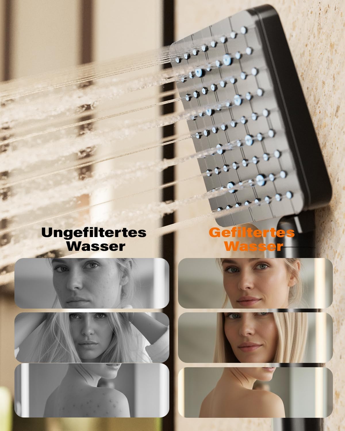 • Подобрена 20-слойна филтърна система: Душът с филтър за твърда вода и маркуч има 20-слойна, мощна филтърна система. Филтърният елемент е изработен от висококачествен KDF, калциев сулфит, активен въглен, витамин C и минерални топчета, които могат ефективно да премахнат остатъчния хлор и тежки метали (олово, живак, никел, хром) и други замърсявания и вредни вещества, спомагайки за възстановяване на здравето на кожата и гладкостта и мекотата на косата. Сменяйте филтъра на душа на всеки 3-4 месеца или при ниско водно налягане.