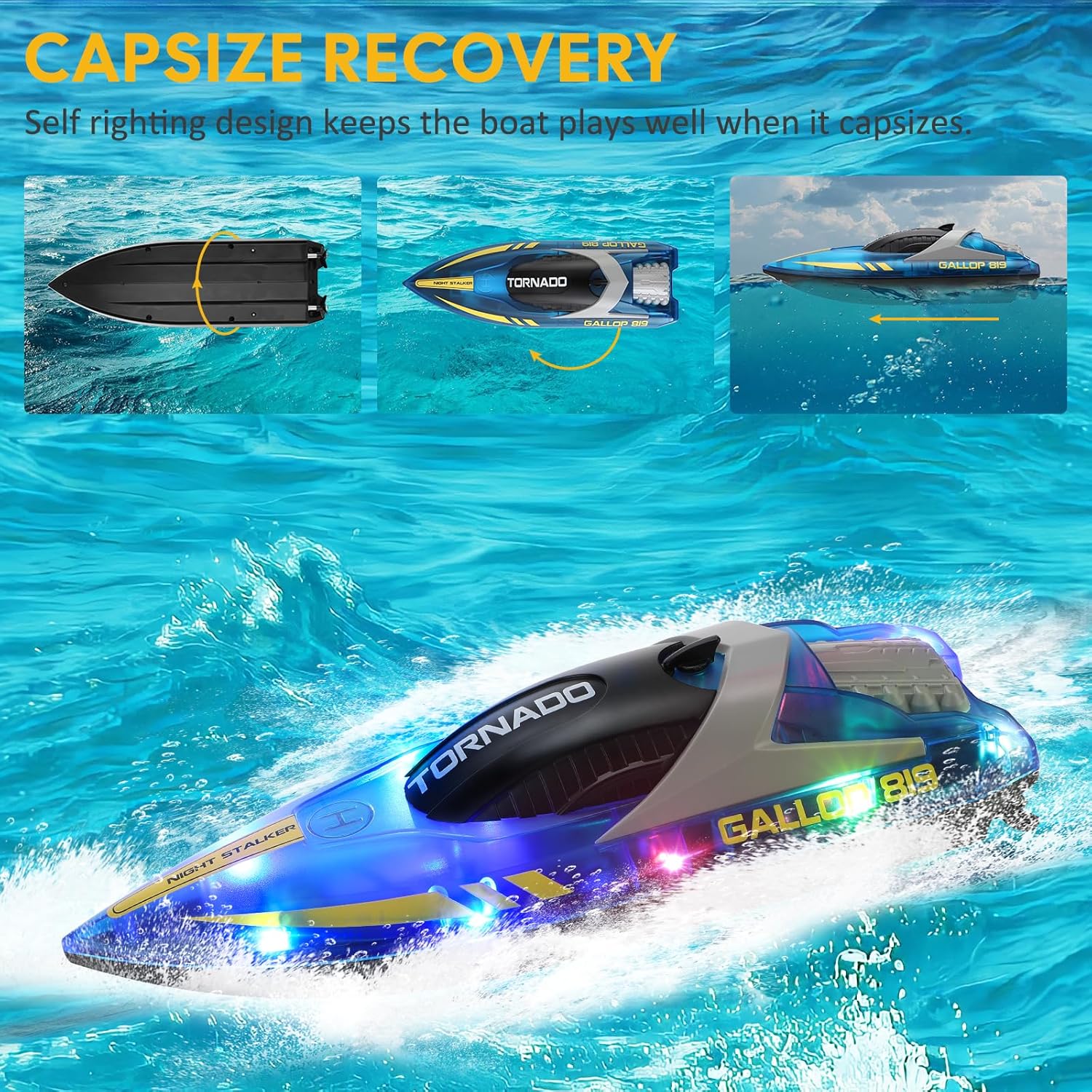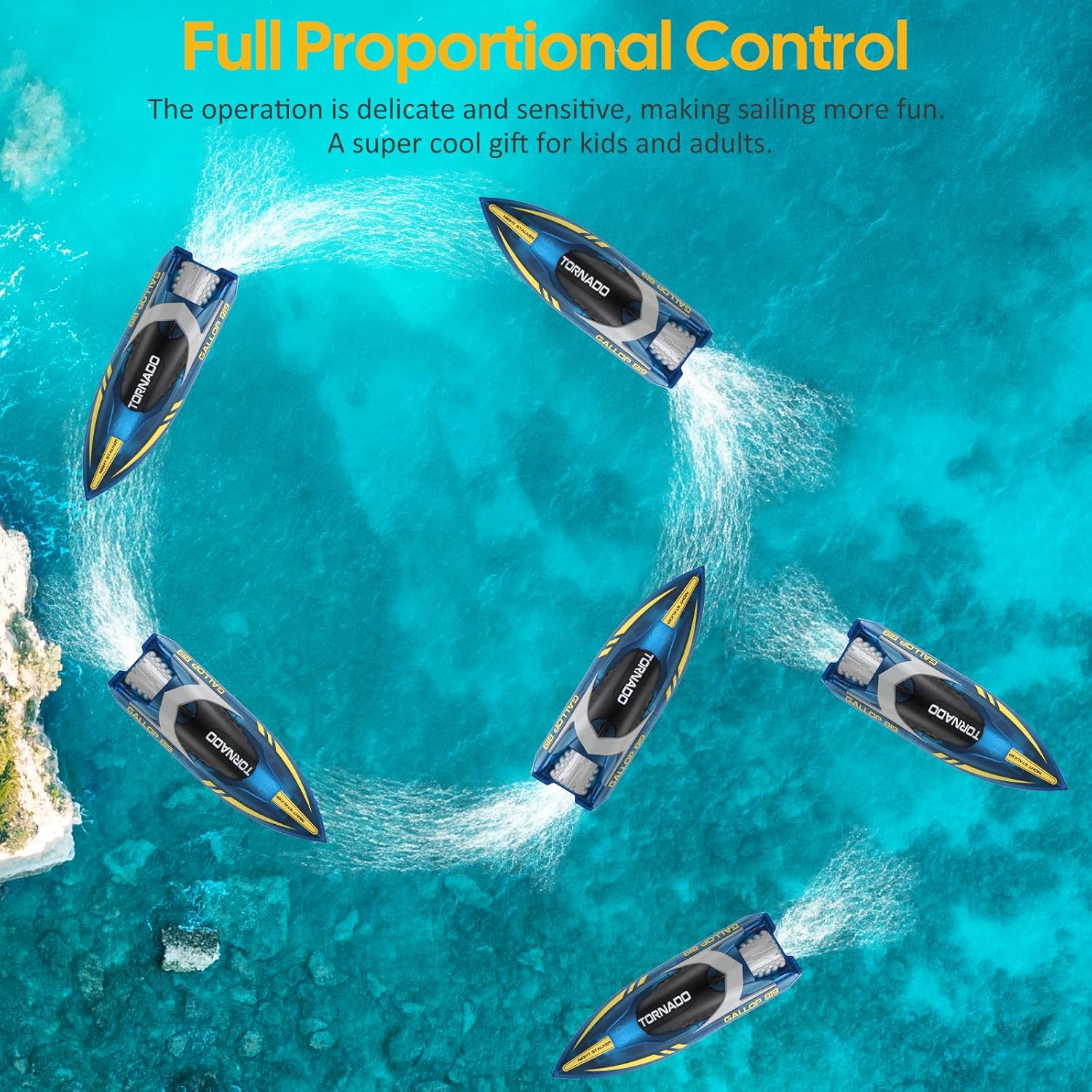 • Възстановяване при преобръщане и напълно пропорционално управление: дистанционното управление 2.4 GHz с чувствителна и чувствителна работа ви позволява лесно да контролирате скоростта и посоката на лодката (напред, назад, надясно и наляво). Дизайнът за възстановяване при преобръщане позволява на лодката да се държи добре, когато е преобърната, без да се притеснявате за преобръщане или остри завои.