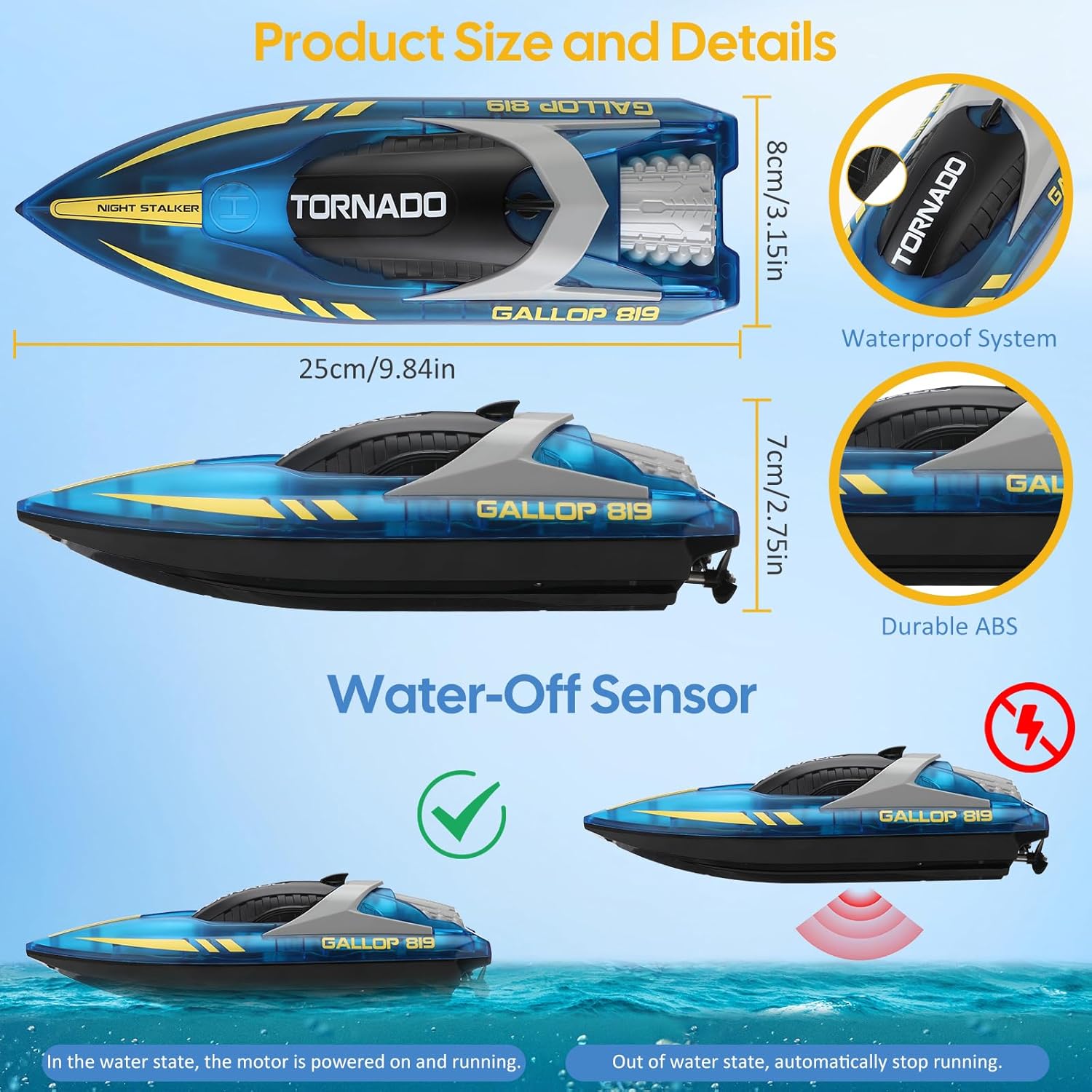 • Висококачествена и водоустойчива защита: тази състезателна лодка за басейни е изработена от висококачествена ABS пластмаса, водоустойчивият капак поддържа люка сух по време на приключението, не е нужно да се притеснявате за насищане. Лодката с дистанционно управление ще стартира двигателя само когато влезе в контакт с вода, което е по-безопасно за децата.