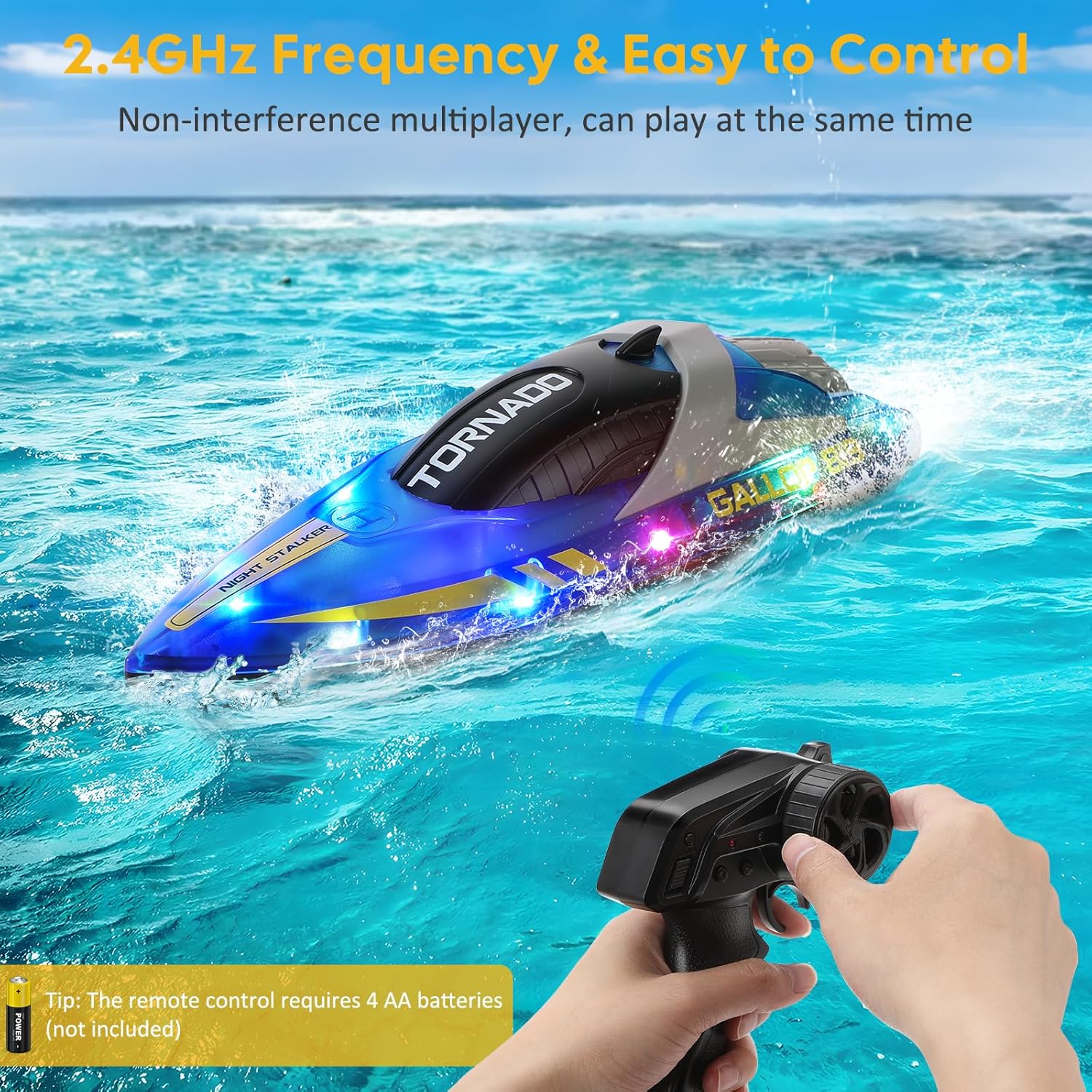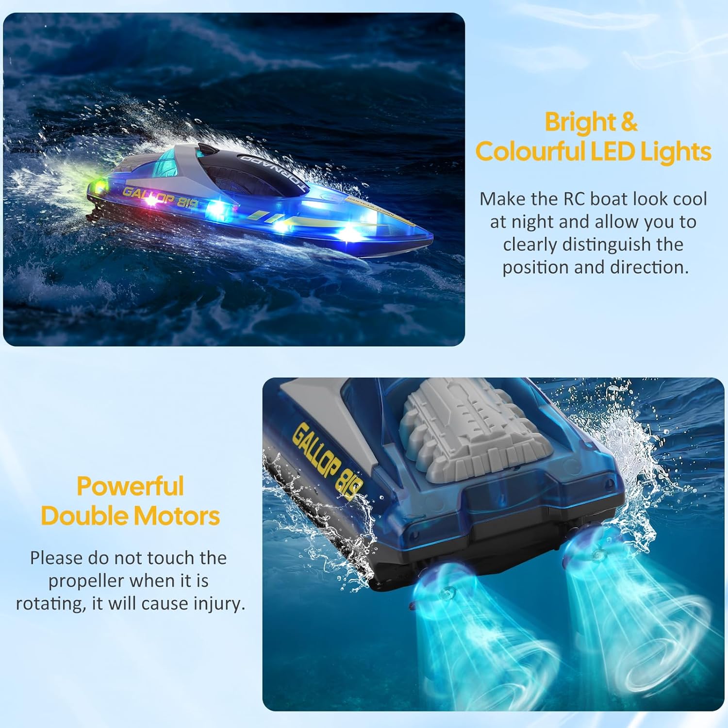 • Високоскоростна RC лодка с LED светлини: нашата дистанционно управлявана лодка за деца и възрастни, вградена в двоен мощен воден охладител с магнитно задвижване, може да достигне скорост от 15 км/ч. Крайната част на лодката е оборудвана с ярки и цветни светлини, така че RC лодката да изглежда готина през нощта и да можете ясно да виждате позицията и посоката.