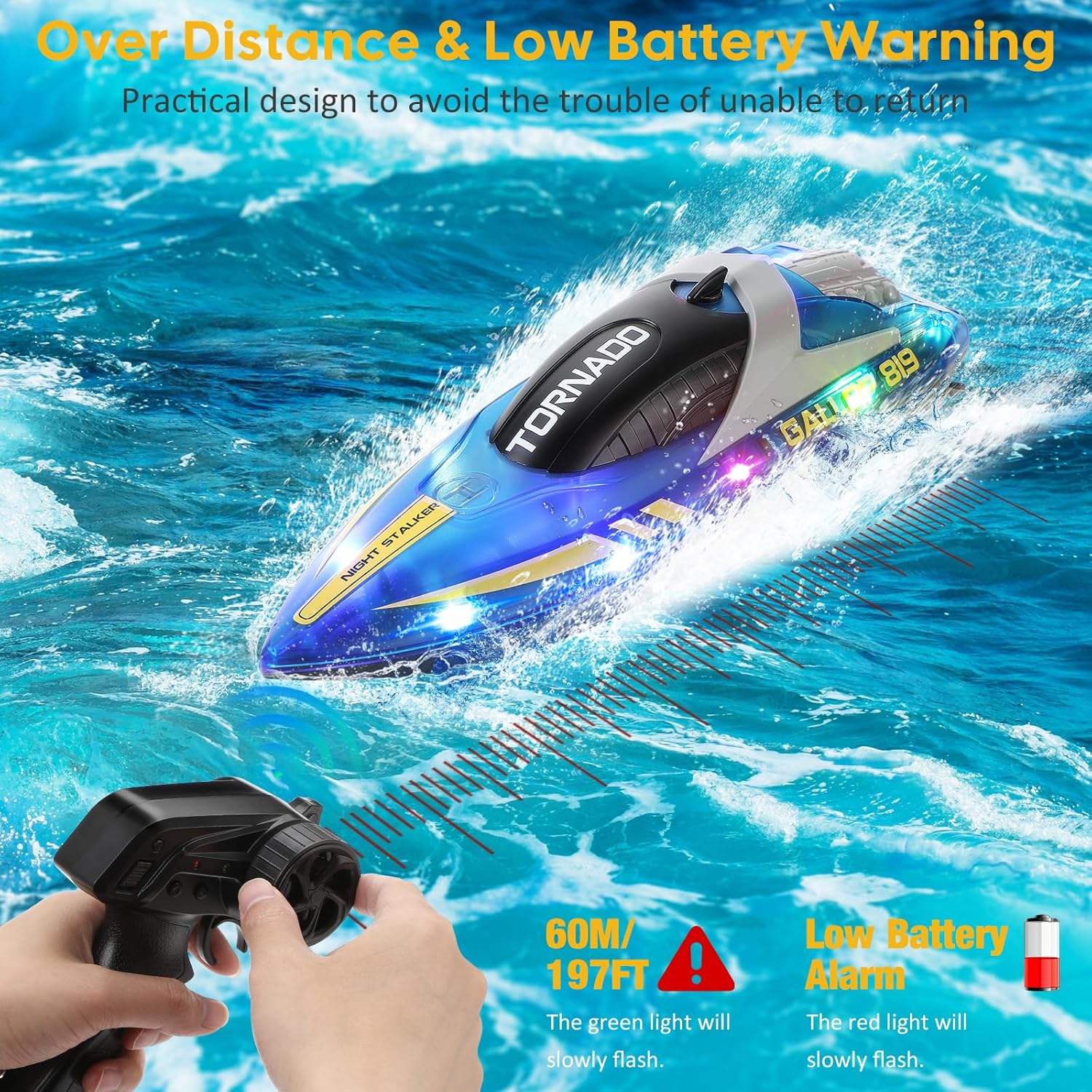• Предупреждение за разстояние и предупреждение за изтощена батерия: моторницата се предлага с акумулаторна батерия 1200 mAh, червената светлина на контролера ще мига бавно, докато батерията е изтощена. Разстоянието на дистанционното управление е приблизително 60 метра, когато лодката излезе извън обхвата на дистанционното управление, зелената светлина мига бавно, за да се избегне неудобството от невъзможност за връщане. Съвет: Дистанционното управление изисква 4 AA батерии (не са включени).