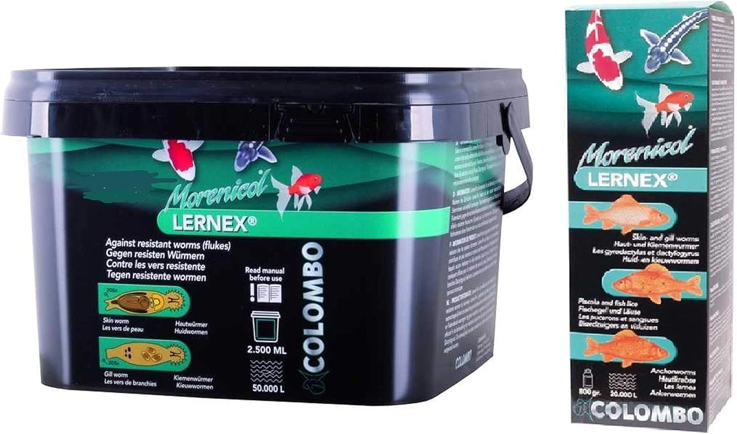 Lernex е ефективен срещу кожни метили (Gyrodactylus), хрилни метили (Dactylogyrus) и кръгли червеи (нематоди). Наличието на тези паразити може да се открие само под микроскоп. Lernex е ефективен и срещу рибни метили (Piscicola), рибни метили (Argulus) и котвени метили (Lernea). Наличието на тези паразити може да се открие с невъоръжено око. Симптомите на заразяване с тези паразити включват летаргия, триене в предмети и намалено хранене. Colombo Lernex е разработен от известния холандски ветеринарен лекар по риби д-р Марио Блом. Рибните метили (Argulus) могат да достигнат размер до половин сантиметър. Те са плоски и кръгли и имат множество хоботчета на корема си. С помощта на две смукалки те се прикрепят към рибата и пробиват кожата ѝ с отровните си усти. Хранят се с телесните течности на гостоприемника, които отделят и изтъркват от дъното и растенията. Argulus снася яйцата си свободно във водата. Ларвите се излюпват от тези яйца и за да оцелеят, трябва да атакуват риба в рамките на един ден. Размножаването не се увеличава под 14 градуса по Целзий, така че проблемите възникват предимно през лятото. Хрилните раци (Ergasilus) са по-малки. Те се прикрепят към хрилете с кукички и се пасат. В резултат на това може да възникне възпаление на хрилетната тъкан. Рибите страдат от дихателен дистрес и дори могат да умрат. Повечето огнища се случват през лятото. Кожните раци (Lernea) могат да достигнат дължина от няколко сантиметра. Те не са червеи, а принадлежат към паразитните ракообразни. Чифтосват се върху хрилете; след чифтосване само женските могат да станат вредни. Те се прикрепят към рибата и се заравят дълбоко в рибната тъкан с главите си, подобни на рога. Следователно първият симптом е кървене в кожата на рибата. Това се разпознава като малко червено петно по рибата. С растежа на лернеите дългите им тела стават видими.