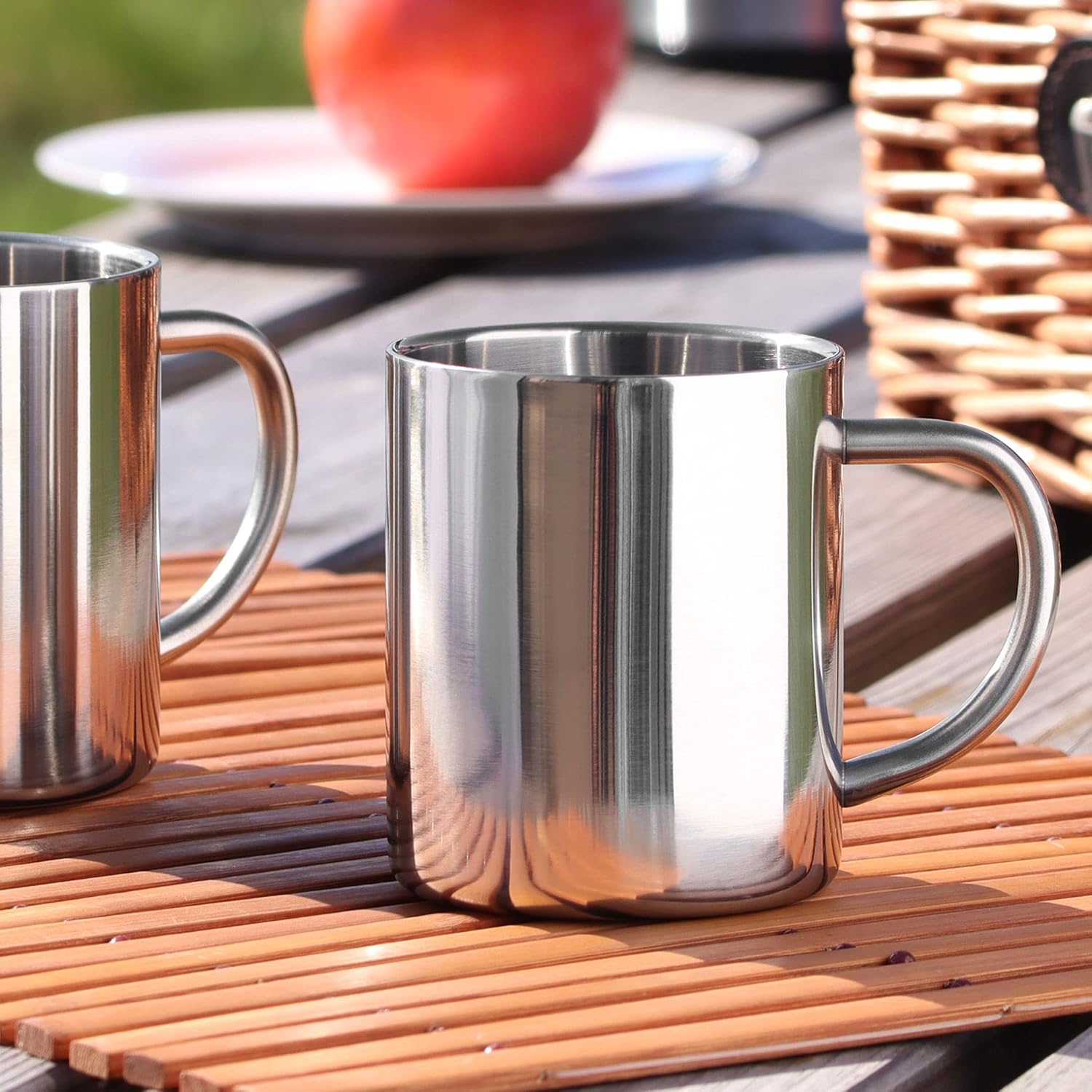• Съдържание на кутията: 2 x чаши от неръждаема стомана. Материал: Неръждаема стомана, устойчива на ръжда, цвят: сребрист; тегло: 130 г на чаша // Размери без дръжката: Височина 9 см x диаметър 7,5 см / вместимост на термочаша за пиене: 280 мл.