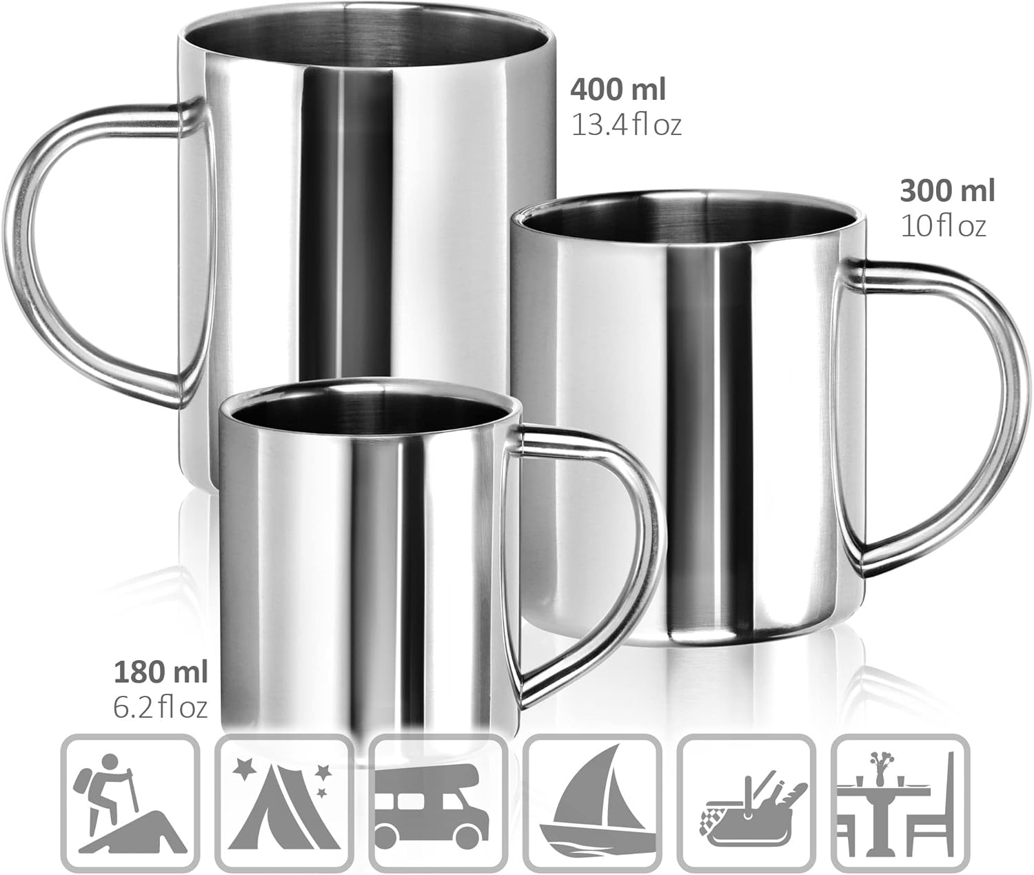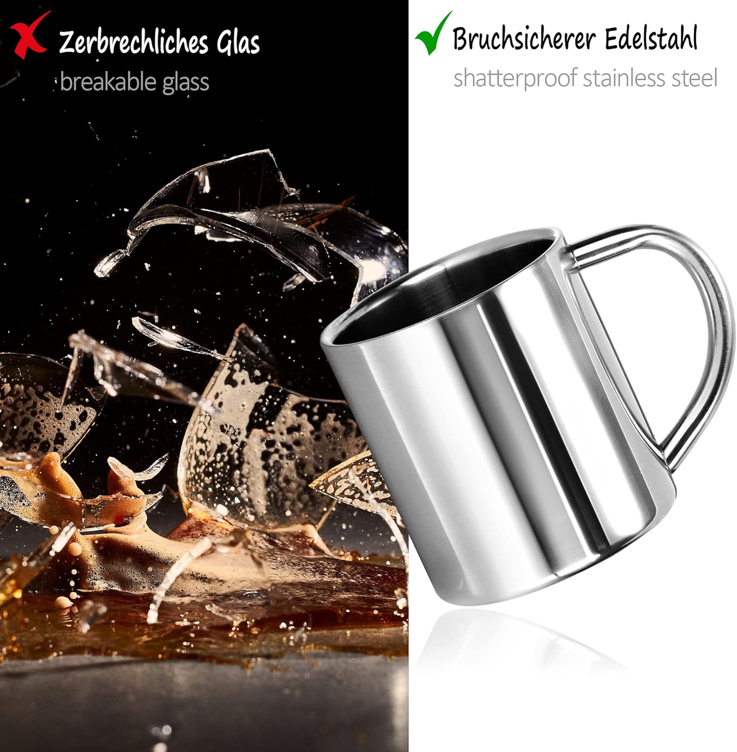• Съдържание на кутията: 2 x чаши от неръждаема стомана. Материал: Неръждаема стомана, устойчива на ръжда, цвят: сребрист; тегло: 130 г на чаша // Размери без дръжката: Височина 9 см x диаметър 7,5 см / вместимост на термочаша за пиене: 280 мл.