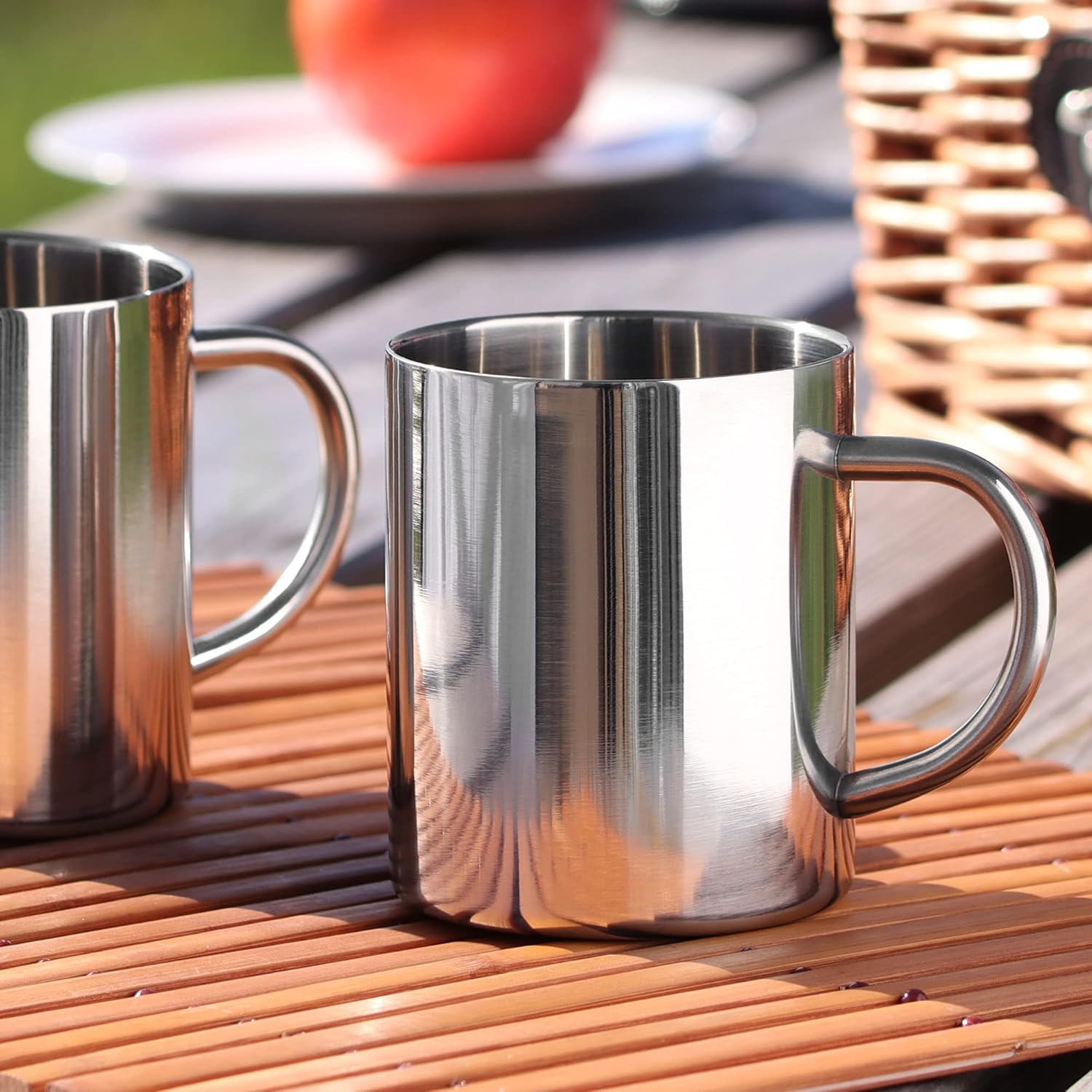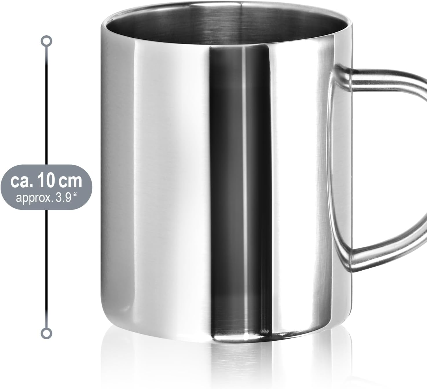 • Съдържание на кутията: 2 x чаши от неръждаема стомана. Материал: Неръждаема стомана, устойчива на ръжда, цвят: сребрист; тегло: 130 г на чаша // Размери без дръжката: Височина 9 см x диаметър 7,5 см / вместимост на термочаша за пиене: 280 мл.