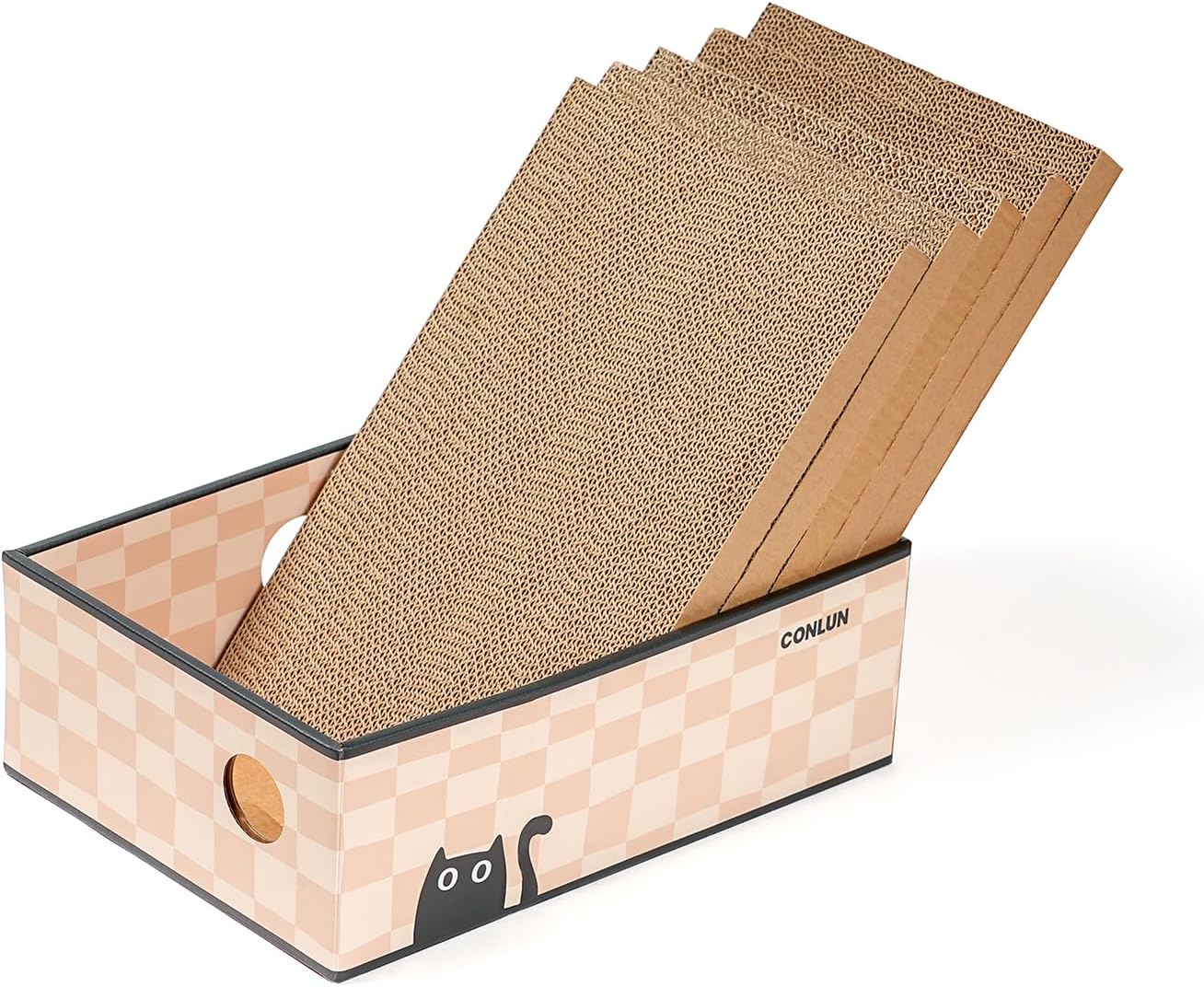 Conlun Комплект от 5 дъски за драскане за котки с кутия, Голям двустранен дизайн, Интерактивни отвори, Чист и издръжлив, Картон за драскане за котки, Защита за мебели (Голяма, шахматна дъска)