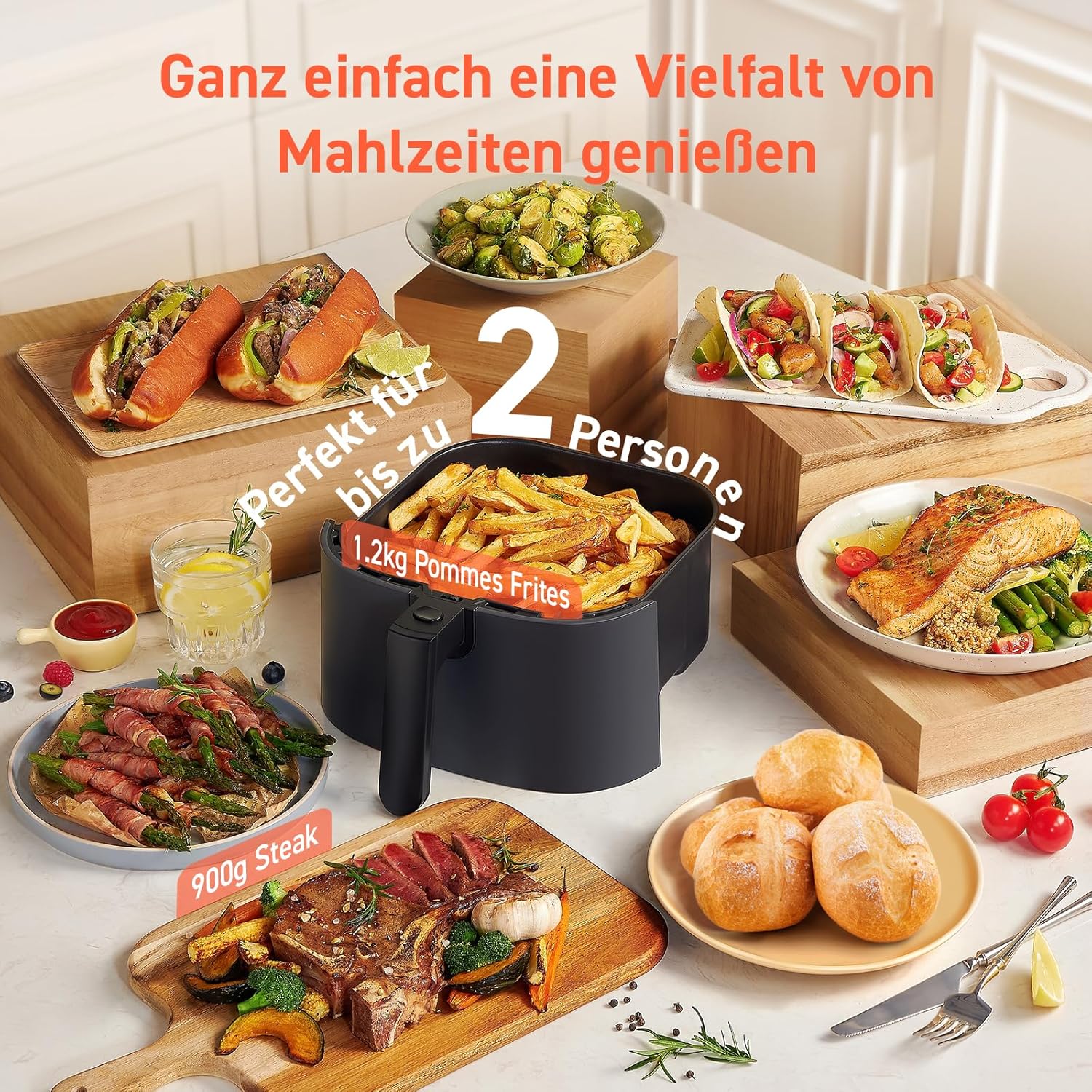 • С максимална температура от 230°C и 360° циркулация на топлината, този фритюрник с горещ въздух осигурява хрупкав и сочен вкус на месото.