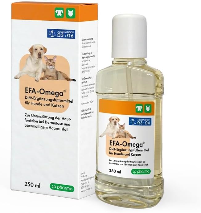 cp pharma EFA-Omega е хранителна добавка, специално формулирана за кучета и котки, за да поддържа нормалната функция на кожата. Съдържа високо ниво на есенциални омега-3 и омега-6 мастни киселини в балансирано съотношение. Тези мастни киселини са основни компоненти на хидролипидния филм на кожата и могат да допринесат за еластичността на кожата, нормалния растеж на козината и оптимизирането на естествената бариера на кожата. За правилна употреба се препоръчва бутилката да се разклати добре преди употреба. Дозирането е лесно с помощта на вградената дозираща камера: котките и малките кучета получават ½ до 1 доза, средните кучета 1 до 2 дози, а големите кучета 3 дози дневно. Една доза е еквивалентна на 9,5 мл. Препоръчителната продължителност на хранене е първоначално до два месеца. Консултирайте се с ветеринарен лекар преди хранене. Продуктът трябва да се съхранява на хладно и тъмно място в оригиналната му опаковка. Всякакви евентуални налични утайки не влияят на качеството на продукта.