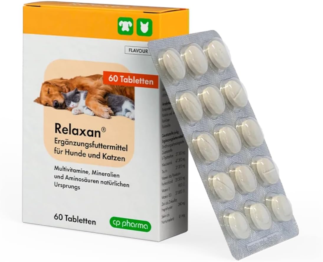 Relaxan® е безценен, ако домашен любимец се отглежда изключително на закрито, трябва да бъде оставян сам за продължителни периоди, лесно се възбужда, лае ненужно или скача върху посетители. Прилаган преди дълги пътувания с кола, посещения при ветеринарен лекар и фойерверки, Relaxan® също може да бъде от голяма полза. Relaxan® действа най-добре, ако се приложи 2-3 дни преди стресовото събитие. Това гарантира, че съставките в Relaxan® се абсорбират достатъчно. Relaxan® компенсира потенциални хранителни дефицити, които могат да се проявят като повишени стрес реакции у животното. Състав: Калциев карбонат, магнезиев карбонат, магнезиев сулфат хептахидрат, хидролизиран растителен протеин (соя, царевица), рапично масло, натриев хлорид. Аналитични съставки: Суров протеин 12,1%, сурови масла и мазнини 6,1%, сурови фибри 1,1%, сурова пепел 56,2%. Инструкции за правилна употреба: Прилагайте таблетките директно или ги строшете и смесете с храна. Котки над 2,5 кг: 1 таблетка на ден. Кученца, кучета до 5 кг: 1 таблетка два пъти дневно. Кучета до 10 кг: 2 таблетки два пъти дневно. Кучета до 20 кг: 3 таблетки два пъти дневно. Дозата може безопасно да се увеличи до 3 пъти дневно, ако е необходимо. За кучета с телесно тегло над 20 кг препоръчваме Relaxan® forte. Relaxan® трябва да се дава само като процент до 7,4% от дневната дажба.