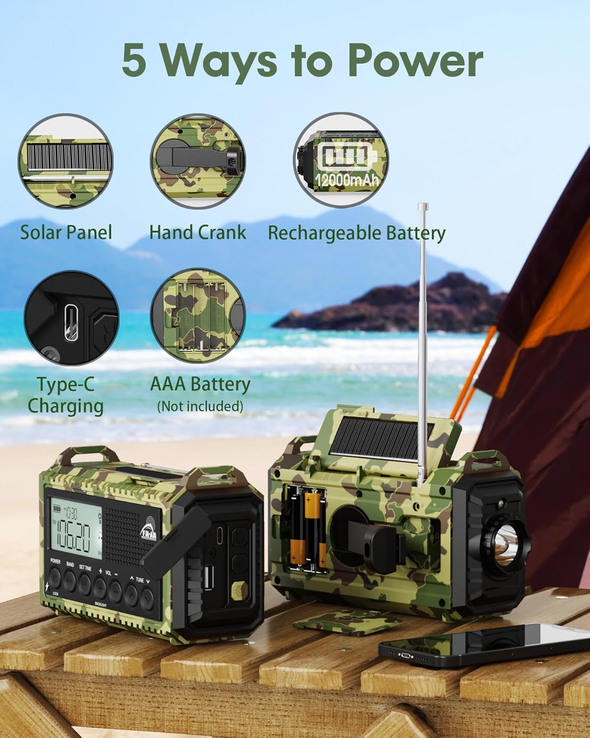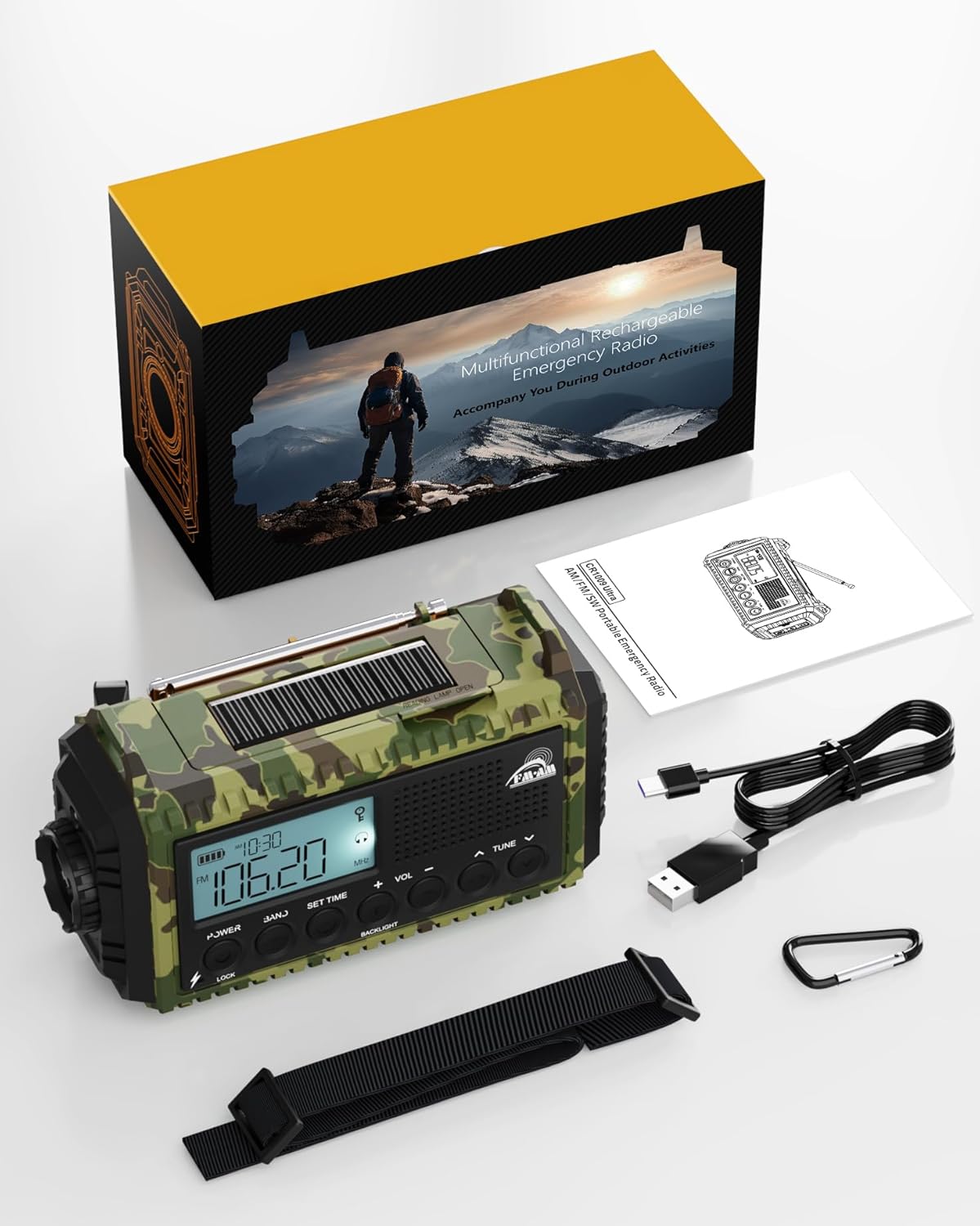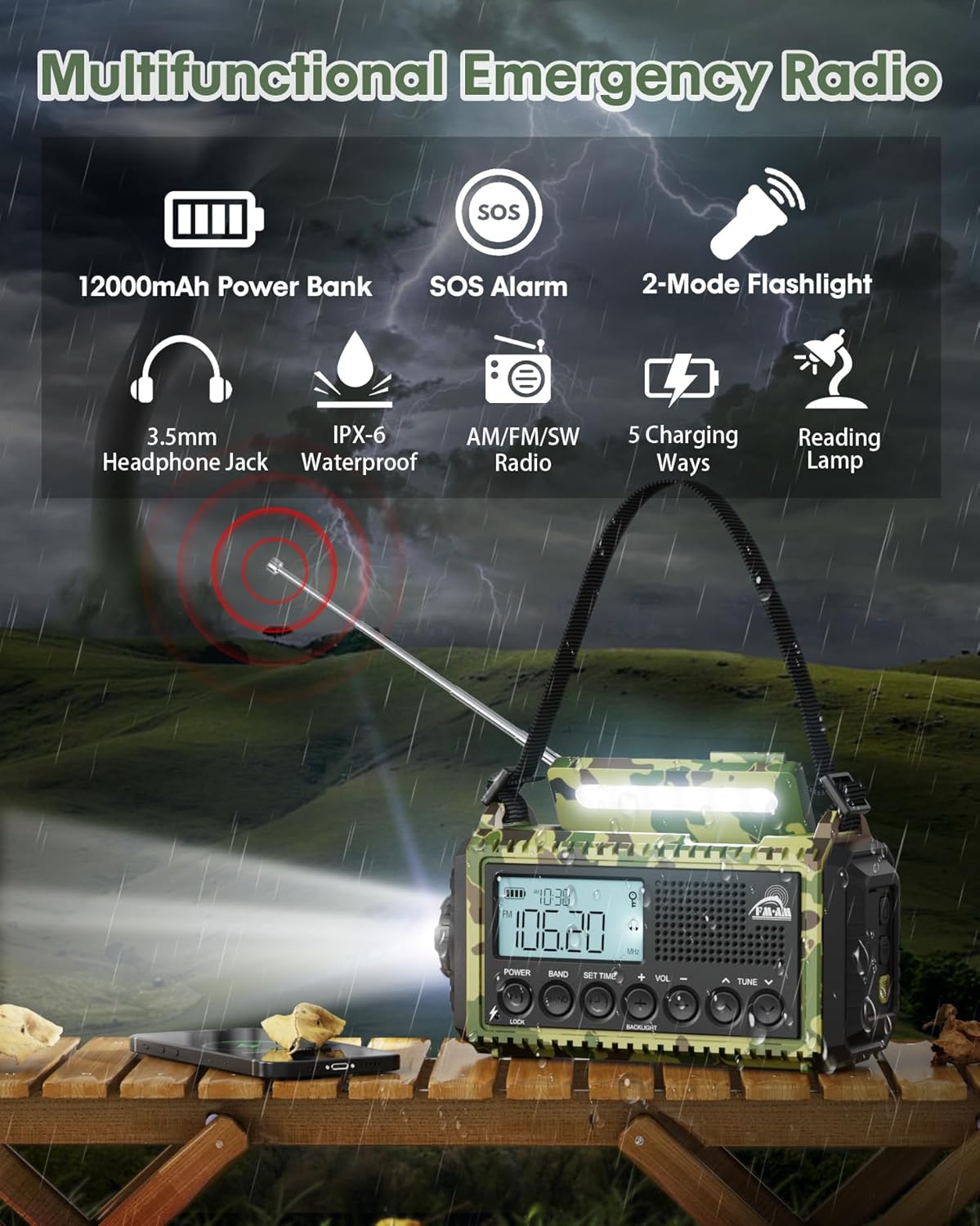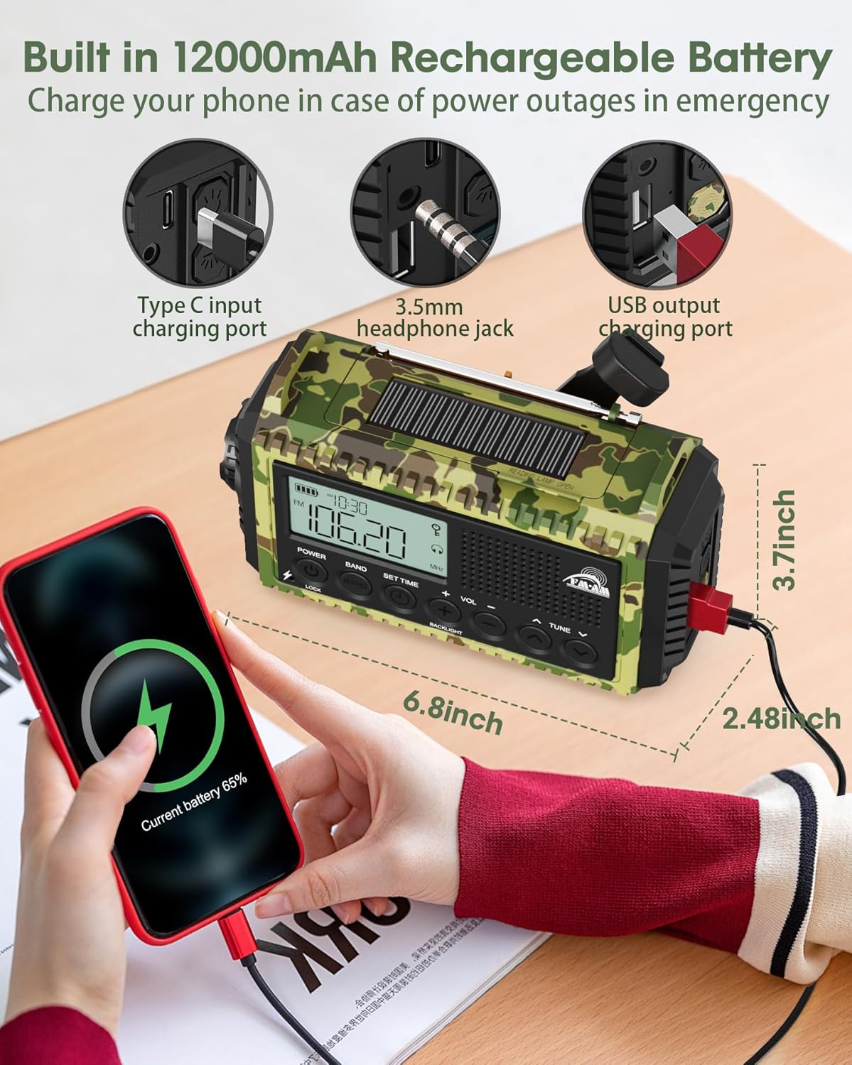 • 【Лесен за инсталиране】 Това аварийно радио има вградена батерия от 12000 mAh и предлага множество опции за зареждане: соларен панел, ръчна манивела и включения USB кабел. Освен това е оборудвано с отделение за батерии за аварийни ситуации (3 AAA батерии, не са включени). LCD екранът показва текущото ниво на зареждане в реално време, така че винаги сте информирани. Когато е напълно заредено, радиото може да възпроизвежда FM радио непрекъснато до 30 часа. Кажете сбогом на внезапните прекъсвания на захранването и винаги бъдете свързани, когато имате най-голяма нужда от него.