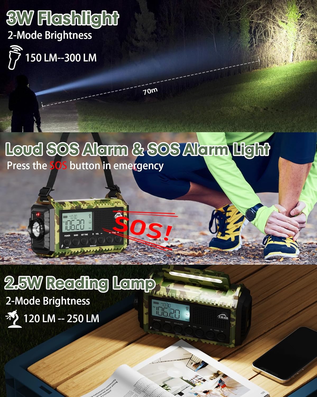 • Дистанционно управление „всичко в едно“ с LED светлина и капак: това устройство е не само радио, работещо с батерии, но и радио с манивела „всичко в едно“ с два източника на светлина с регулируема яркост. Яркият фенер от лявата страна с мощност 2,5 W/3 W (20 часа работа при пълно зареждане) може да освети разстояние до 70 метра, идеално за търсене, когато се изгубите в тъмното. Лампата за четене с мощност 2 W/2,5 W (40 часа работа при пълно зареждане) може да освети стая от 20 м², идеална за осветление на къмпинга.