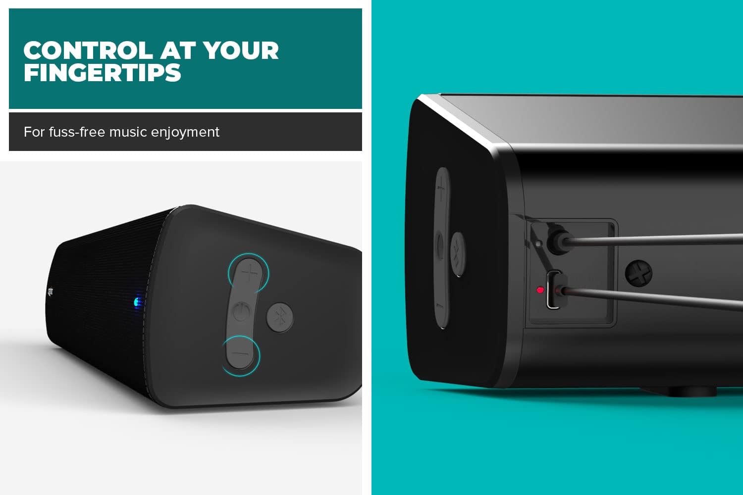 • Лесно управление и лесна настройка - Бутоните за възпроизвеждане и сила на звука са удобно разположени отстрани на саундбара, за безпроблемно управление в обсега на една ръка. Настройката на Creative Stage Air V2 е лесна с USB-C порта или 3,5 мм жак входа на гърба на саундбара, така че можете да съхранявате кабела спретнато.